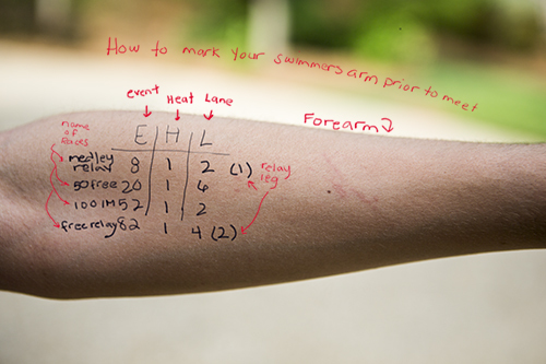 Be aware that if you apply sunscreen to the area where you marked your swimmer up, it will melt off right before your eyes. Please either skip this little area or apply sunscreen 20 minutes prior to marking your swimmer up to allow the sunscreen to soak in. This fact is helpful when trying to remove all the markings from your swimmer following the meet.
