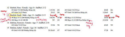 We ask for your help in marking your swimmer up prior to arriving at the meet. Below is a pictorial showing how to mark up your swimmer for their races. On rare occasions a swimmer's lineup may change when they arrive to the meet. The Bullpen parents will update your swimmers markup.
