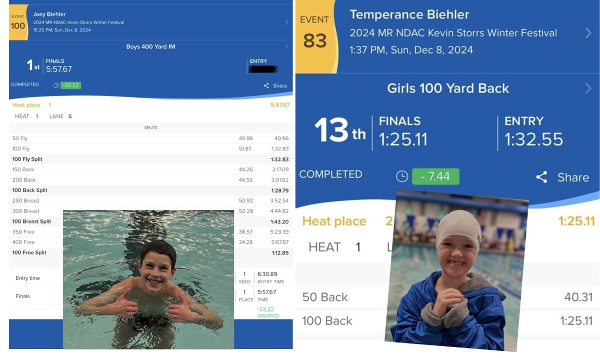 Joey Biehler demolished the old team record in the 9-10 boys age group by 48 seconds in the 400 IM with a time of 5:57.67.