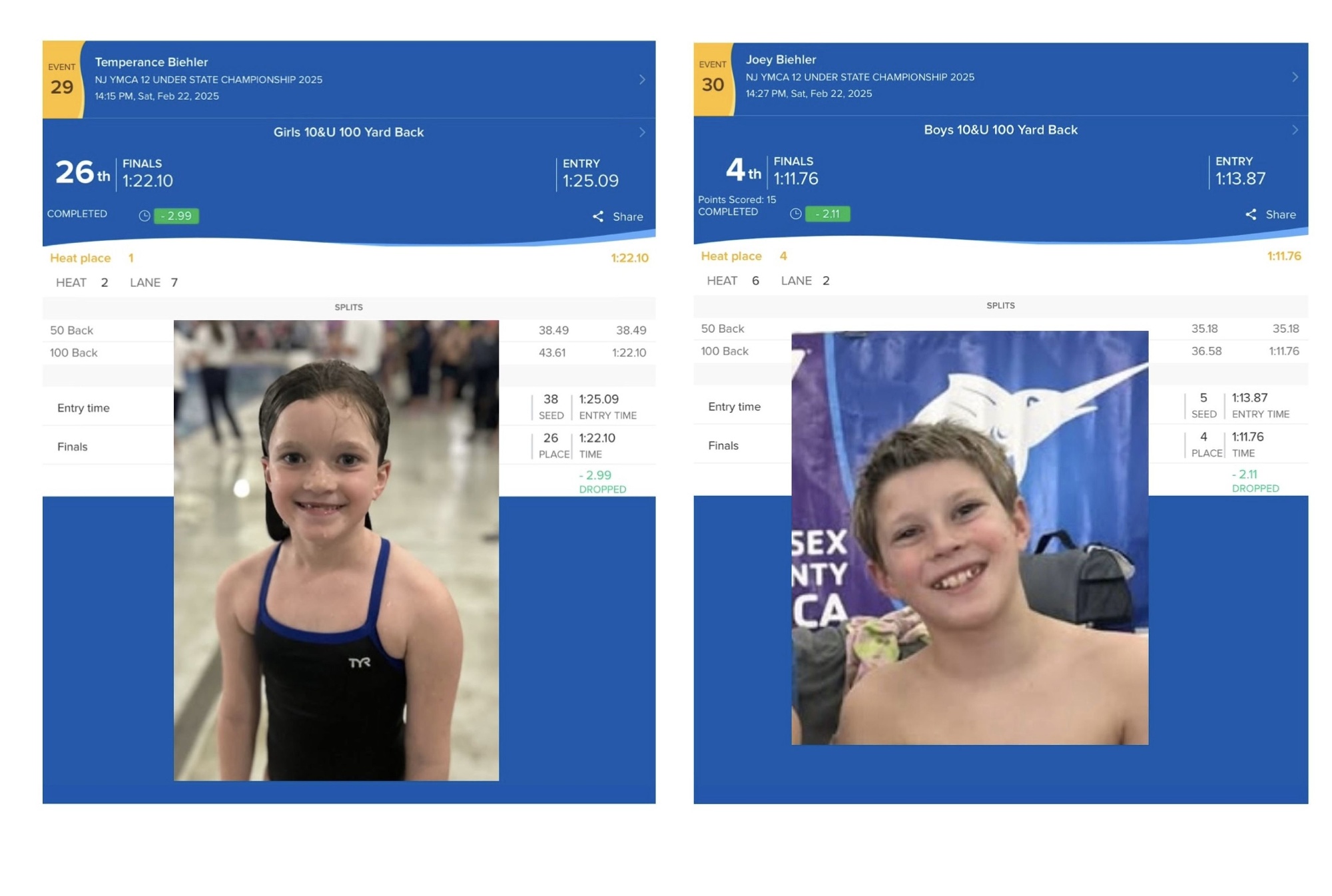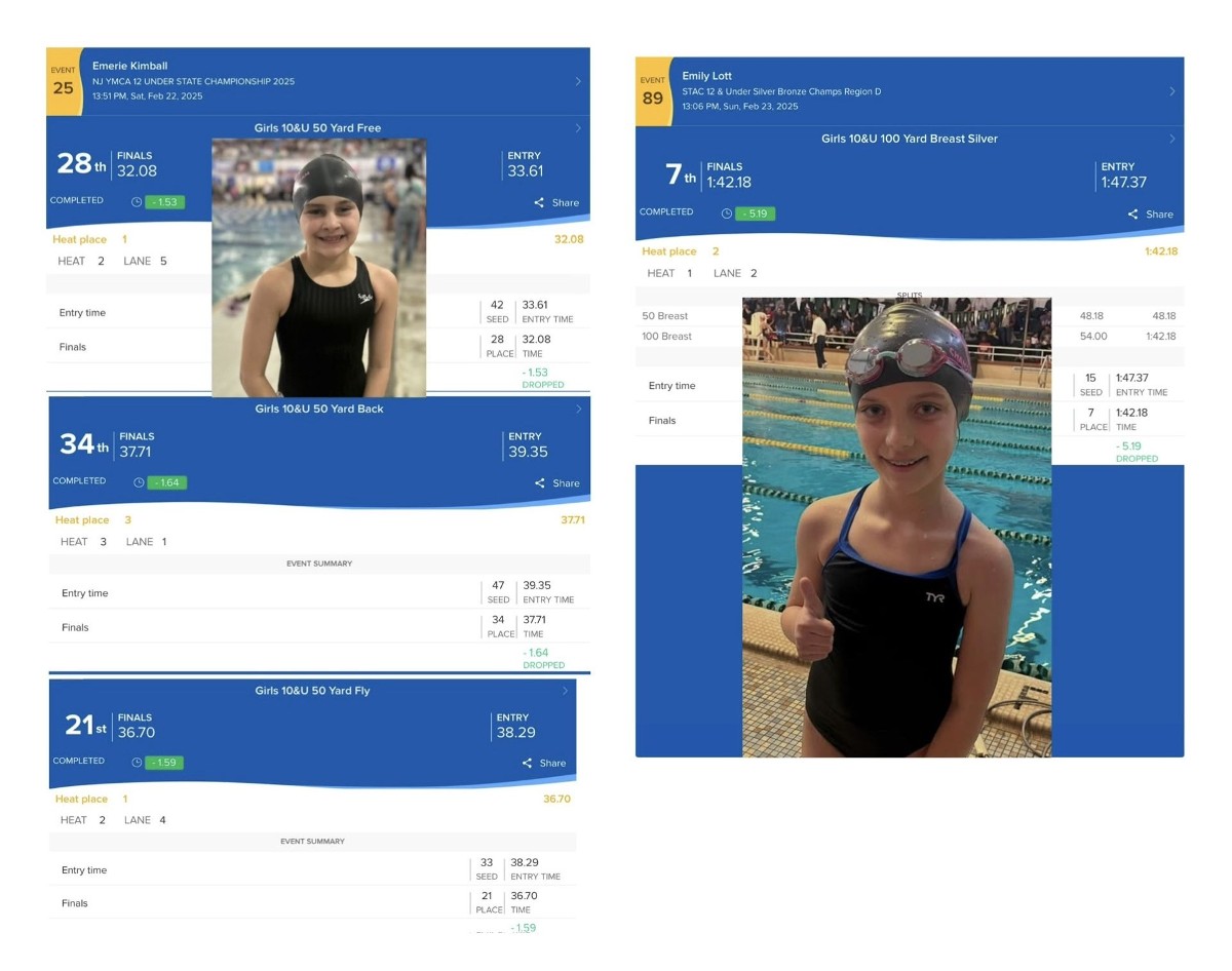 CONGRATULATIONS to Tempe Biehler, Joey Biehler and Emerie Kimball for breaking 5 team records at the YMCA 12 & Under State Championships and Emily Lott for breaking 1 team record at the NJS 2025 Silver / Bronze Championship this weekend!