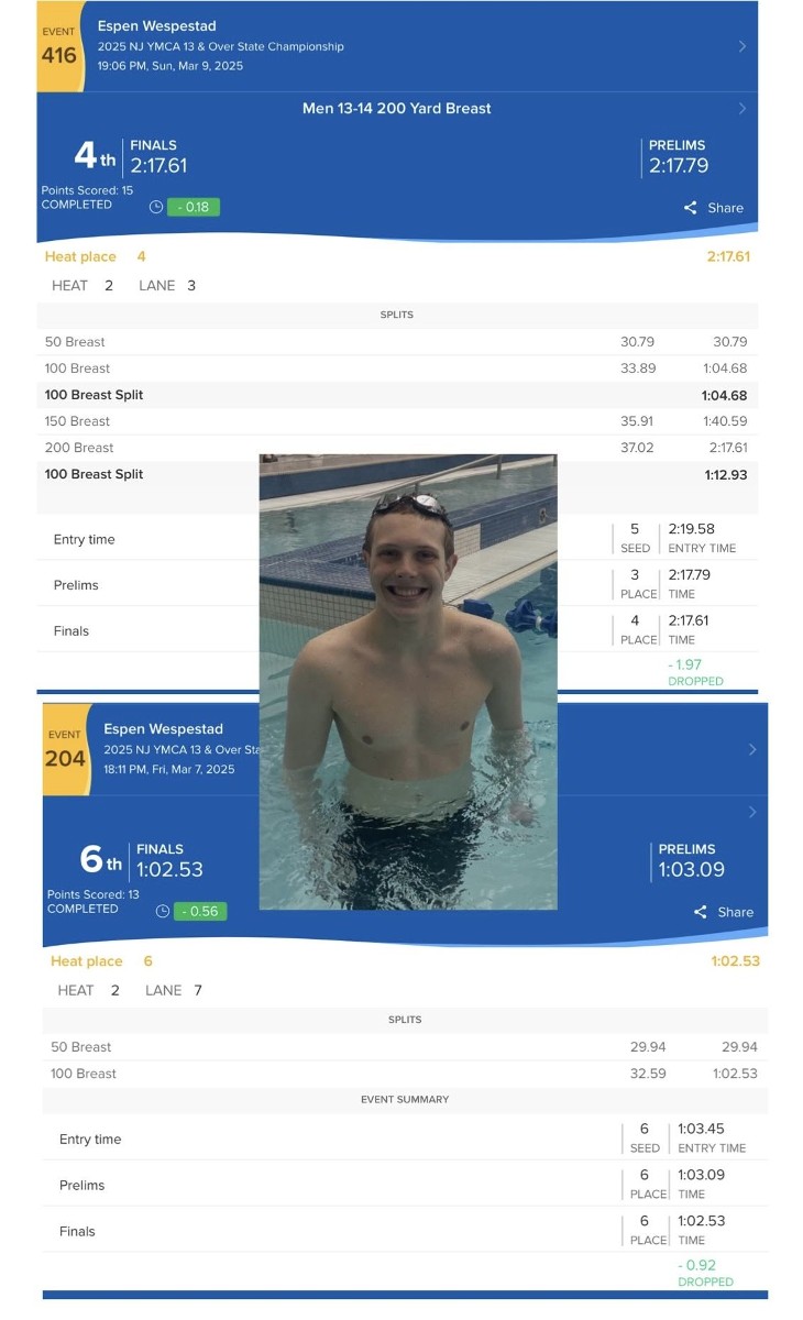 CONGRATULATIONS to Espen Wespestad for breaking TWO team records at 13 & Over YMCA States Championships in the 13-14 Boys 100 Breast (1:02.53) and 200 Breast (2:17.61).