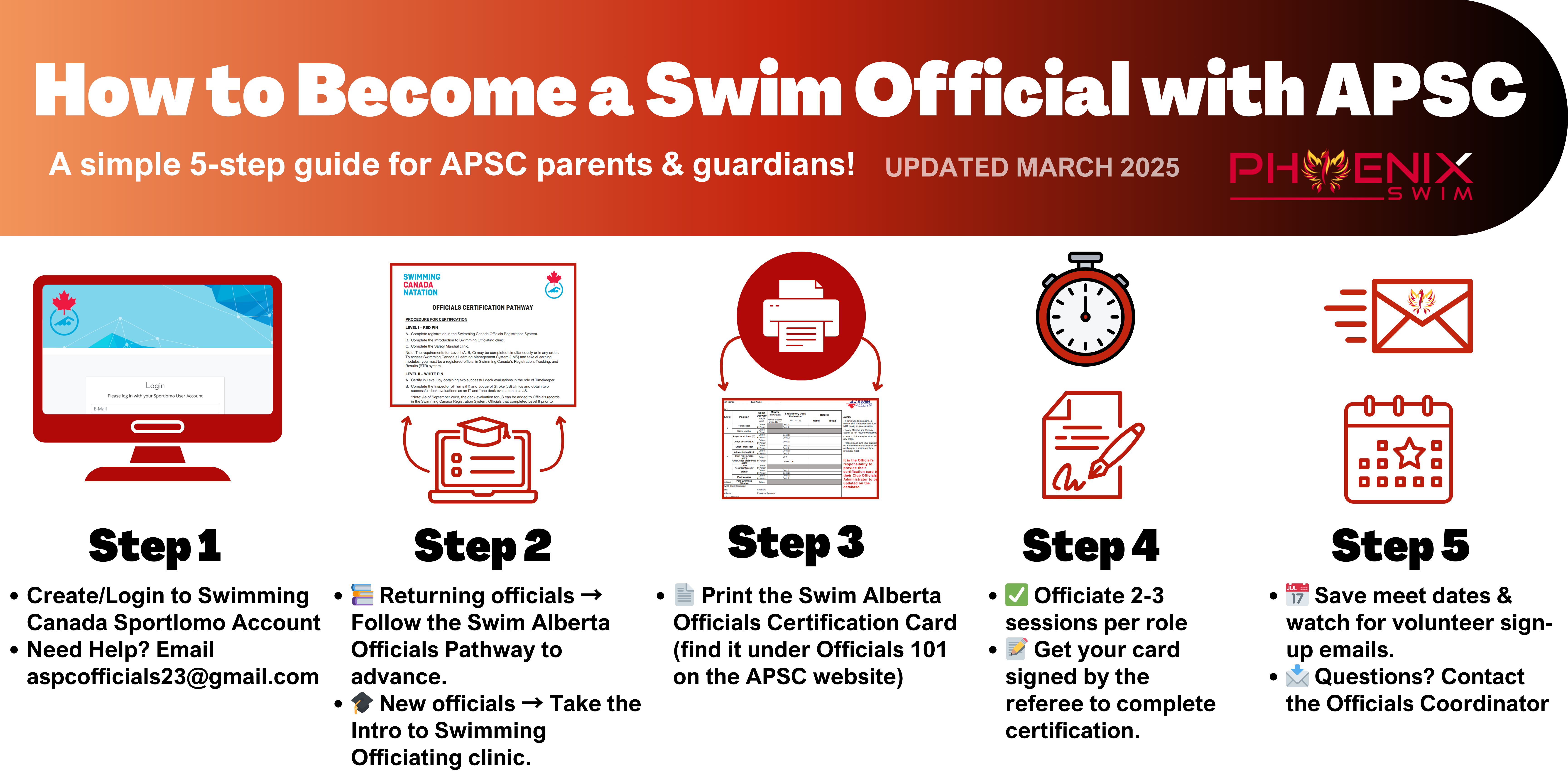 Officials are volunteer parents who have taken formal training offered through Swim Canada and Swim AB to help run swim competitions. We like to think of it as having the best seat in the house! You will be on deck helping in one of many important positions that are needed for the competition to go smoothly. Each position requires a different skill set, so there will always be a position that helps you play to your strengths! Officiating at competitions hosted by the Airdrie Phoenix Swim Club will help contribute to your volunteer commitment (1 Home APSC Meet + 1 Fun meet). Every APSC family must provide one parent/guardian to officiate at APSC's Fundamentals Meet + 1 of 2 Fun Meets. Below, please find more information regarding what is required of parents/guardians at the start of each season.