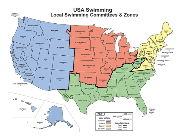 The Eastern Zone is made up of 12 LSCs - Adirondack, Allegheny Mountain, Connecticut, Maryland, Maine, Metropolitan, Middle Atlantic, New England, New Jersey, Niagara, Potomac Valley and Virginia.