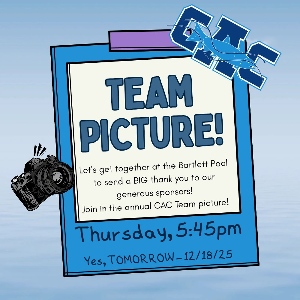 CAC Families, Mark your calendar for the team's Winter Party Dec. 27th from 3-5pm at the Bartlett Pool. We will celebrate the days getting longer and have a chance to just play in the water. The booster board is bringing cookies and hot chocolate. WE STILL HAVE MANY EVENTS still happening: *Winter Splash Deadline is the 31st of Dec. - Sign up today! !0 and Unders- you will please sign up for the 10 and U meet. *Christmas Eve Morning- We have our 100 x 100's, 75's, 50's or 25's....