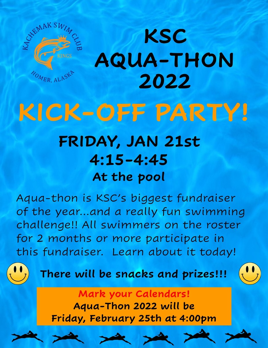 Hi awesome swim families! Just a reminder our Aqua-Thon Kick-Off Party is TOMORROW, Friday, 21 January 2022 from 4:15-4:45 at the pool. This will be a brief meeting for BOTH SWIMMERS AND PARENTS to learn more about Aqua-Thon and this will be your opportunity to pick up your packets. There will be snacks and prizes for swimmers who attend.