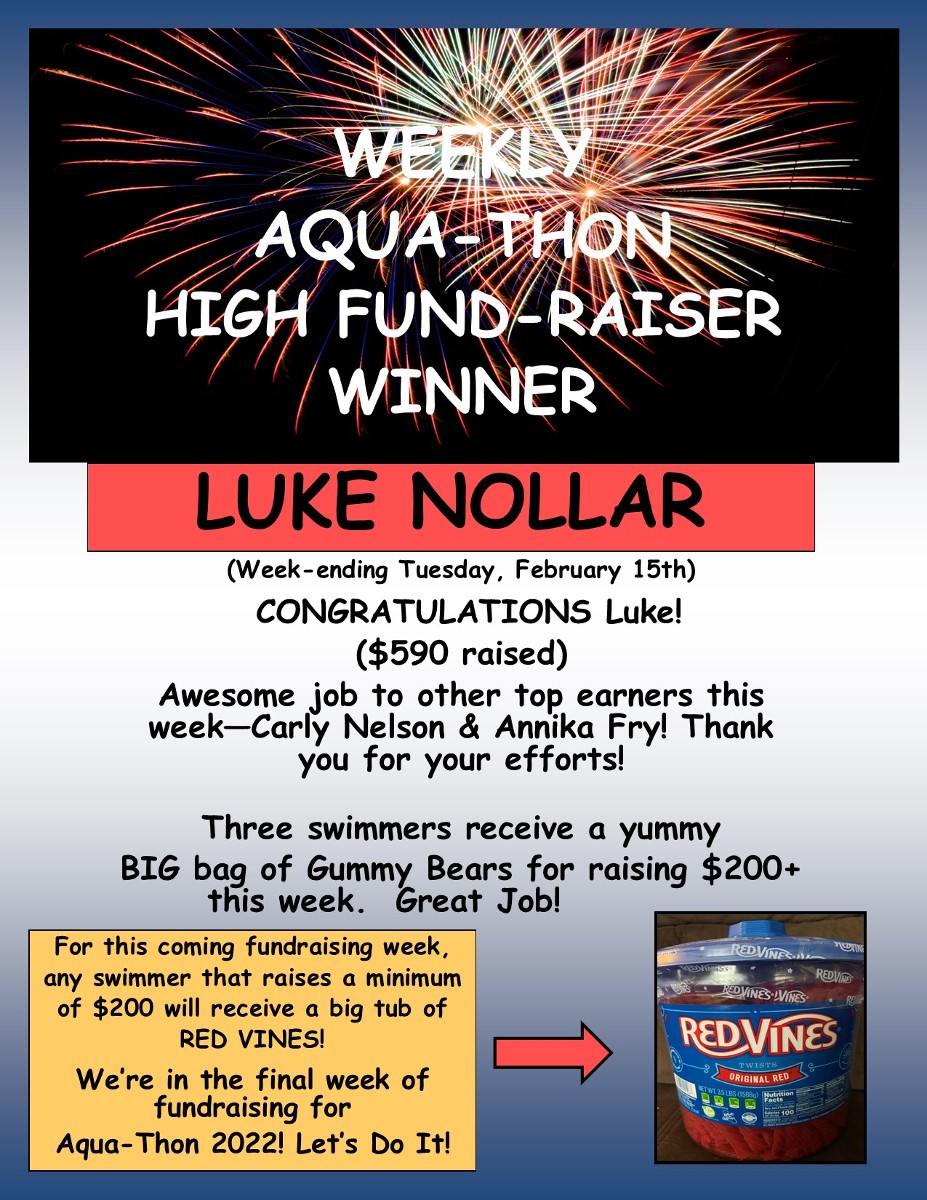 Kudos to Luke Nollar for raising $590 this past fundraising week. There are only 9 days left to fundraise for our biggest (i.e. very important) fundraiser of the year--Aqua-Thon 2022! For all you procrastinators out there, it's time to get to it! Anyone who raises at least $200 thru next Tuesday will recieve a big tub of Red Vines.