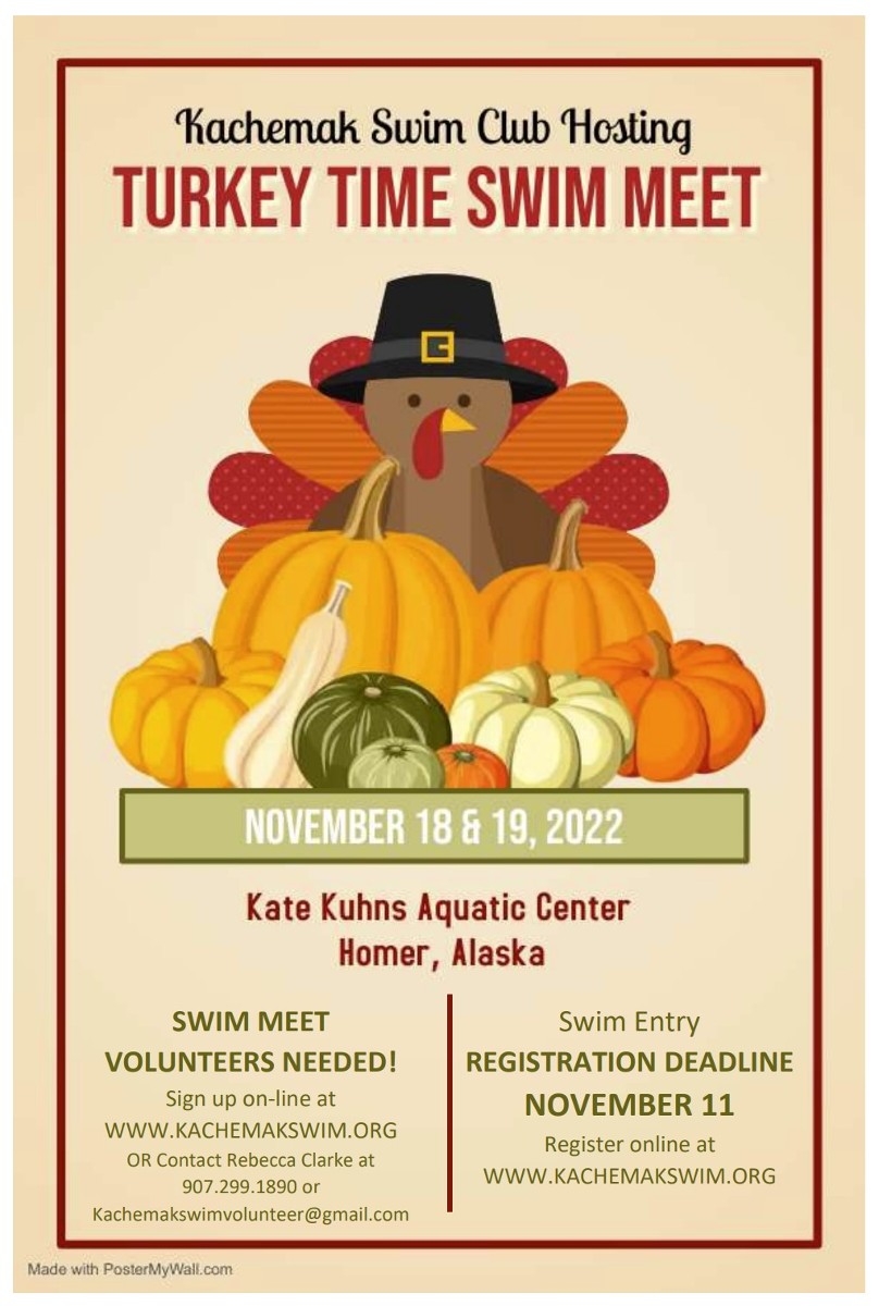 It is time for our Turkey Time home swim meet! Turkey Time will take place on November 18th & 19th. We would love for all of our swimmers to participate. We also need volunteers and food donations for concessions and hospitality.