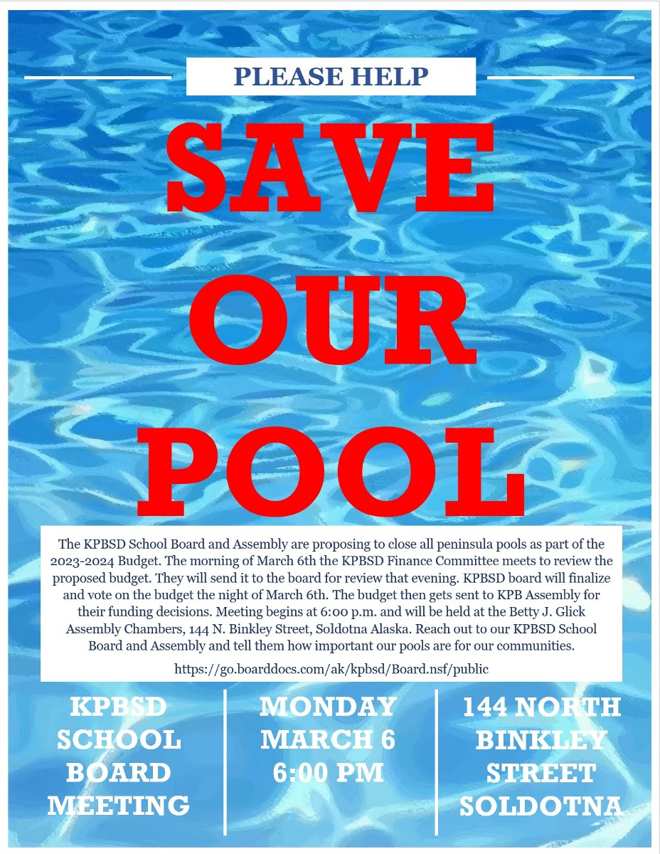 The KPBSD School Board and Assembly are proposing to close all peninsula pools as part of the 2023-2024 Budget. The morning of March 6th the KPBSD Finance Committee meets to review the proposed budget. They will send it to the board for review that evening. KPBSD board will finalize and vote on the budget the night of March 6th. The budget then gets sent to KPB Assembly for their funding decisions. Meeting begins at 6:00 p.m. and will be held at the Betty J. Glick Assembly Chambers, 144 N. Binkley Street, Soldotna Alaska. Reach out to our KPBSD School Board and Assembly and tell them how important our pools are for our communities.