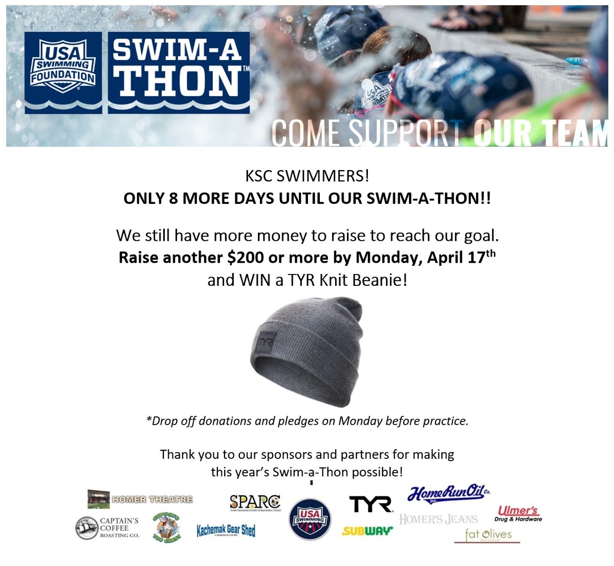 Swim-a-ThonTM participants can earn cool prizes from the USA Swimming Foundation and from KSC; plus, qualified teams are automatically entered into the Swim-a-ThonTM contest where you'll have the opportunity to earn prize packages . . . one lucky team will win a visit from an Olympian!