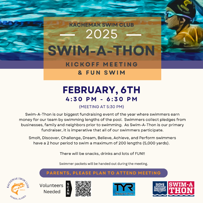 A successful Swim-A-Thon will ensure ongoing, effective, and professionally delivered aquatic programs, expansion and support the operational expenses of the organization. Most importantly it covers short falls in our operating budget, as dues alone will never cover all costs of maintaining pools and running a high-quality swim program. Kachemak Swim Club also utilizes funds from the Swim-A-Thon to support our swimming scholarships for lessons and swim team members in need of reduced tuition.