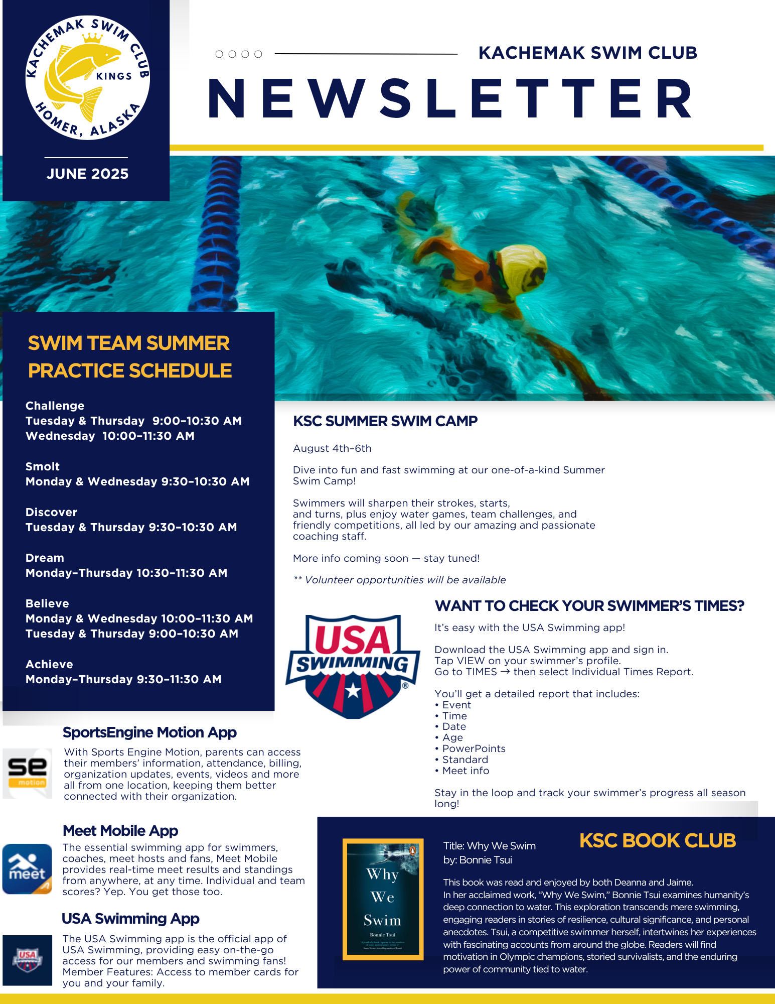 Summer is officially in full swing, and so is the summer swim season! This month’s newsletter is packed with everything you need to stay in the loop, from practice schedules, to swim camp info and shout-outs for our amazing swimmers. Dive in to find important reminders, upcoming events, and ways to stay involved with the club.