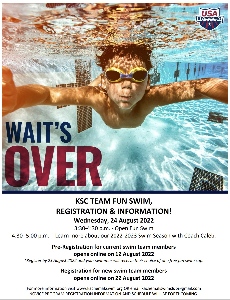 Reminder KSC team fun swim this week, Wednesday, August 24th from 3:30-5 p.m. PARENTS Coach Caleb will talk about our upcoming 2022-2023 swim season at 4:30 p.m. Looking forward to seeing everyone back at the pool! Registration opens for new swim team members Monday, August 22nd. PLEASE NOTE: Novice Program registration and information will be coming soon.