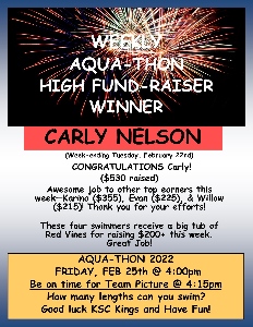 Hello KSC Families and Swimmers, Aqua-Thon 2022 is just around the corner! Fundraising has surpassed $10,000 of our $15,000 goal and there are still many Pledge Per Length donations that will be factored in after the event. A big thank you to all the swimmers that have worked hard at seeking pledges in support of their swim club! The Aqua-Thon schedule is: Arrive at 4:00pm and stop at check-in table to drop off your Aqua-Thon pledge packet (collect after event if pledges still need to be collected). Swimmers suit up...