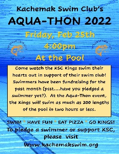 TODAY IS AQUA-THON!!! A few reminders for our swimmers and parents . . . * 4:00 p.m. Arrive - Bring Aqua-Thon packets. Swimmers will have until March 16th to collect their pledge money and any additional funds raised. All Aqua-Thon money needs to be turned in by March 16th. * 4:15 p.m. Team picture, with suits on. * Every swimmer needs a lap counter. * We still need volunteers for food and water for our swimmers! Please visit www.kachemakswim.org to sign up. Thank you, parents, for your help and support...