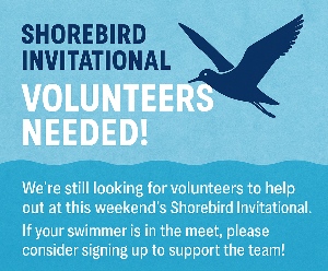 We’re still looking for volunteers to help make this weekend’s Shorebird Invitational a success! If you have a swimmer participating, please consider signing up to lend a hand. You don't have to have a swimmer in KSC to volunteer, everyone is welcome! We especially need help with: Lane timers for Friday Concessions Sales Contributing $15.00 to the purchase of Sandwiches for Hospitality Hospitality Manager Large Green Salad Fruit & Veggie Trays Your support makes a big difference—thank you for helping us create a fun, smooth meet for all! Thank you...