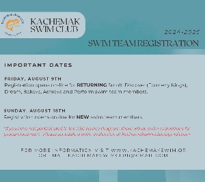 Hello Kachemak Swim Club families, Kachemak Swim Club is excited to announce our online registration (www.kachemakswim.org) that will start on August 9, 2024 for returning Smolt, Discover (Formerly Kings), Dream, Believe, Achieve and Perform swim team swimmers! *Please note: this is not the Novice Program registration. Registration will open for new members on August 18, 2024. If you have not participated in swim team over the past year or have not graduated from the Novice Program Parr group, you will need to schedule an evaluation. Please email [email protected] to schedule...