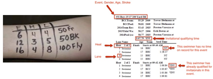 - With the heat sheet, you will want to write your swimmers events, heats, lanes and what they are swimming on one of their arms with a Sharpie. (Don't worry, they think it is cool to have a temporary tatoo to show off to friends at school on Monday but it will be gone after a few showers!) The above picture is a sample of how to write on the arm. If you have any questions, please see a coach or a board member!