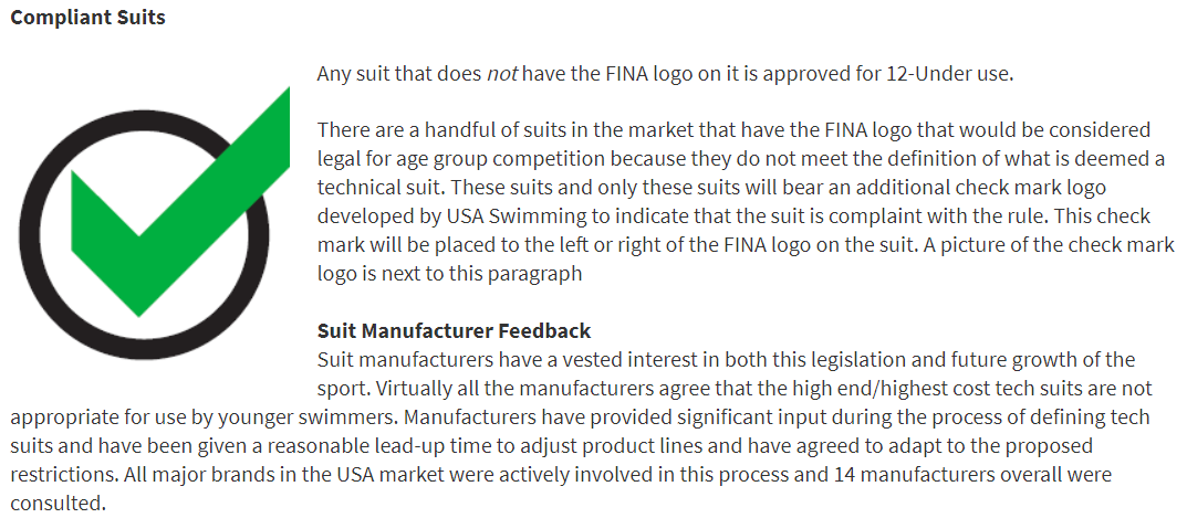Starting September 1, 2020, 12 & younger swimmers may not wear a 'technical suit' at any USA Swimming competition (below the National level meets). Most suits are not considered tech suits. Suits that are allowed for 12&U swimmers will either: