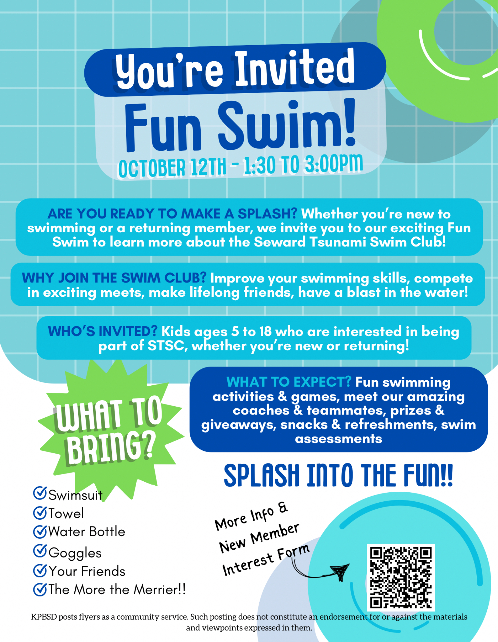 Interested in joining the Seward Tsunami Swim Club? Come to the Fun Swim for New and Returning Swimmers!