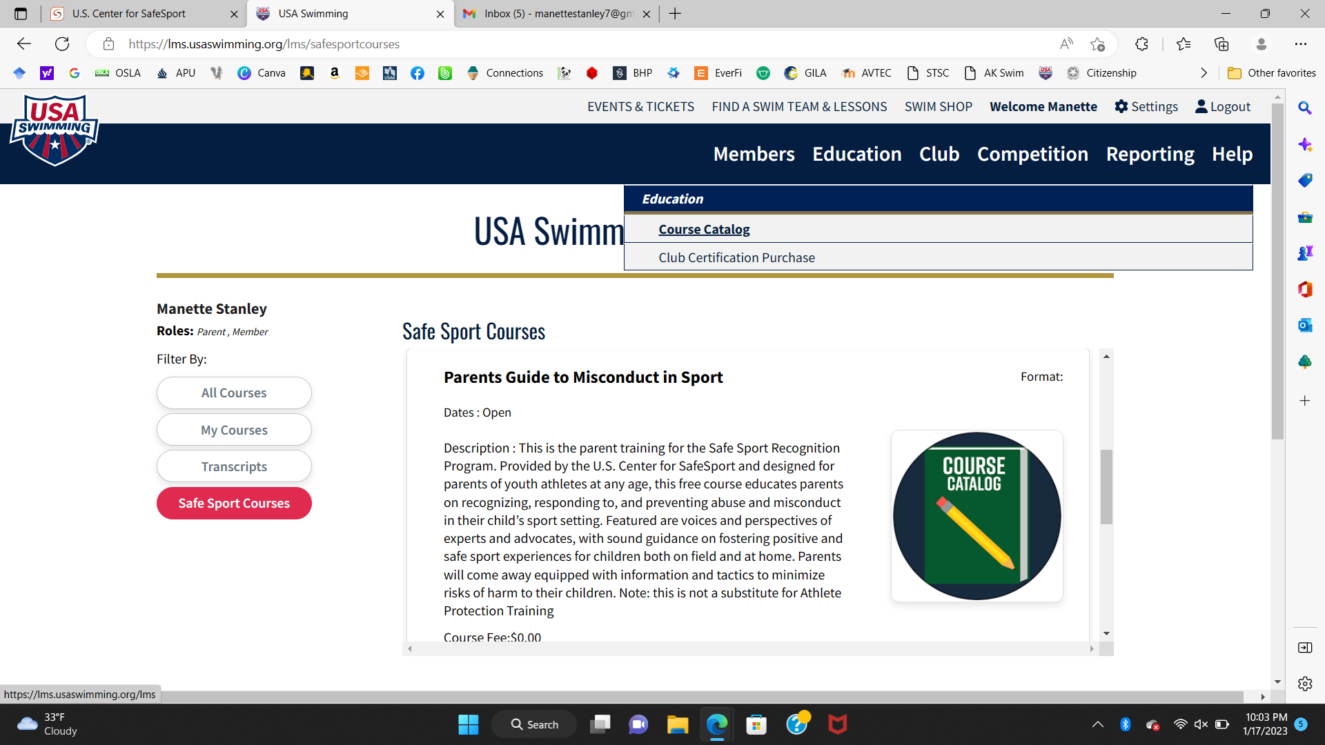You should be at USA Swimming University. Select Safe Sport Courses on the left side of the screen.