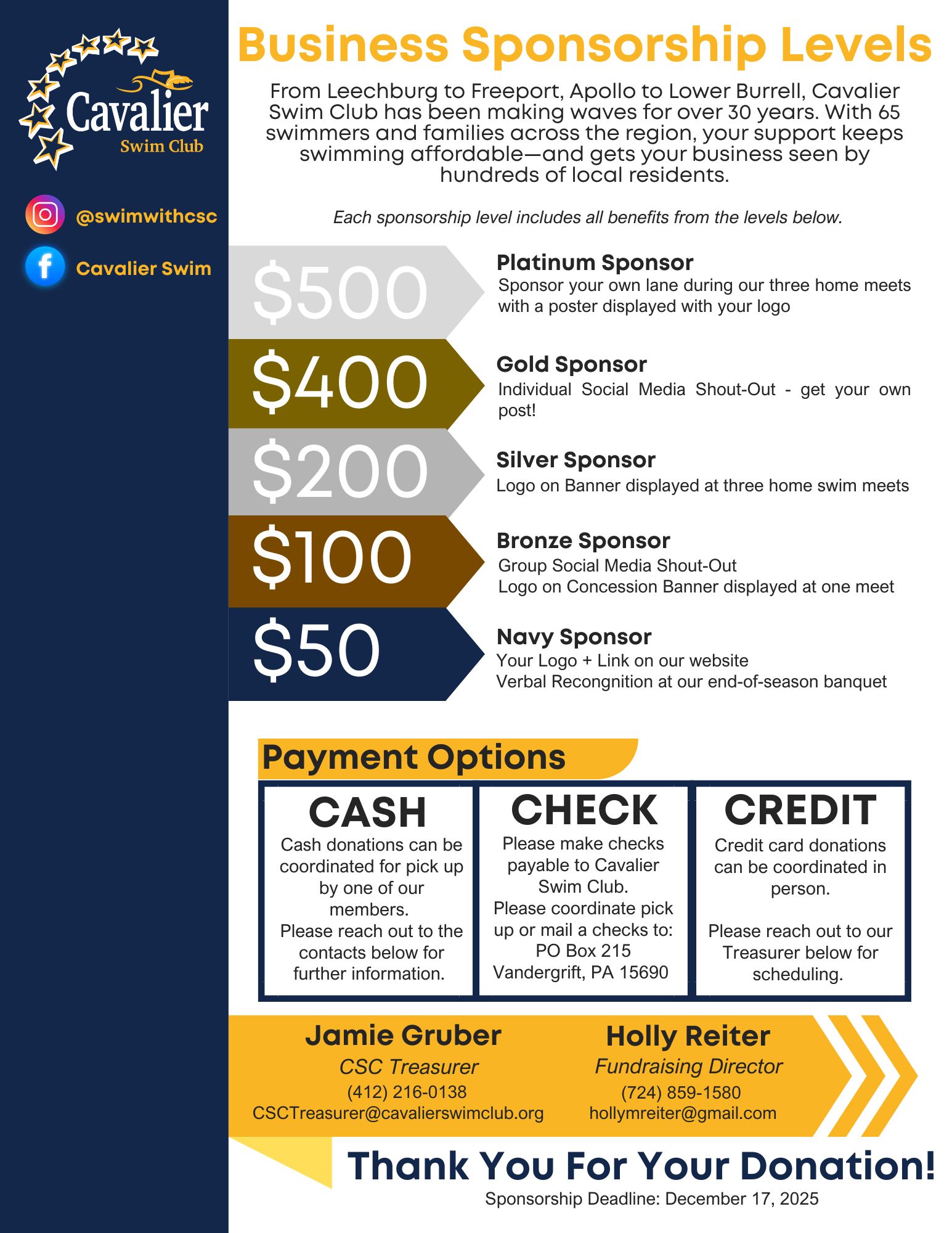 Do you want to sponsor Cavalier Swim Club? See info below!
