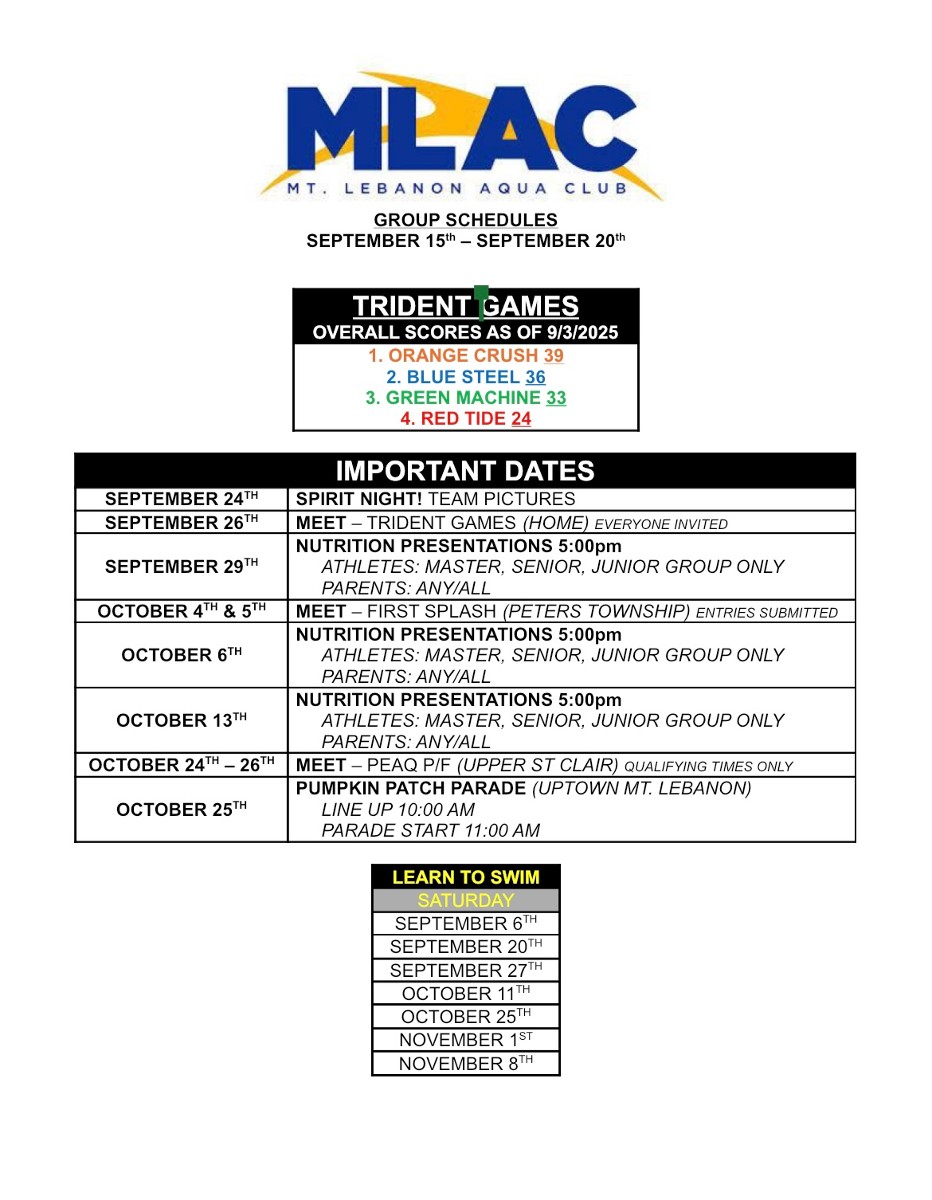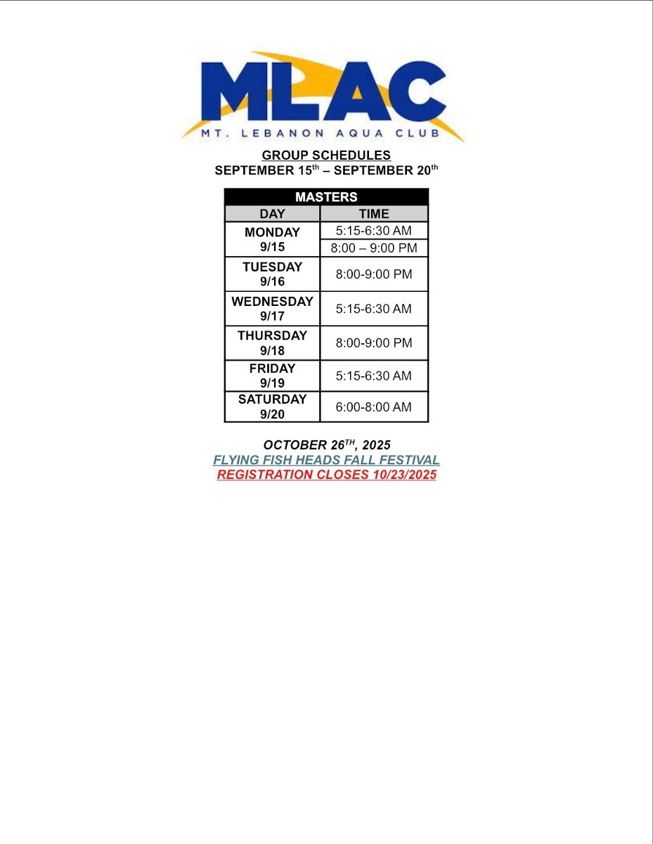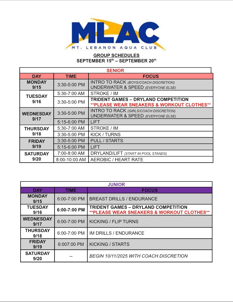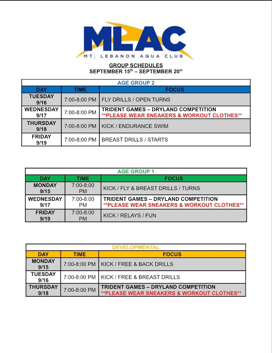Attached you will find the full pool schedule for all MLAC groups. As you find your group label, you will see the general focus for each practice. This will give some insight into our coaching staff’s plan for the week and help you prepare accordingly. Schedules can also be found on the MLAC Home Page >> SportsEngine tab >> scroll down to “Latest News”