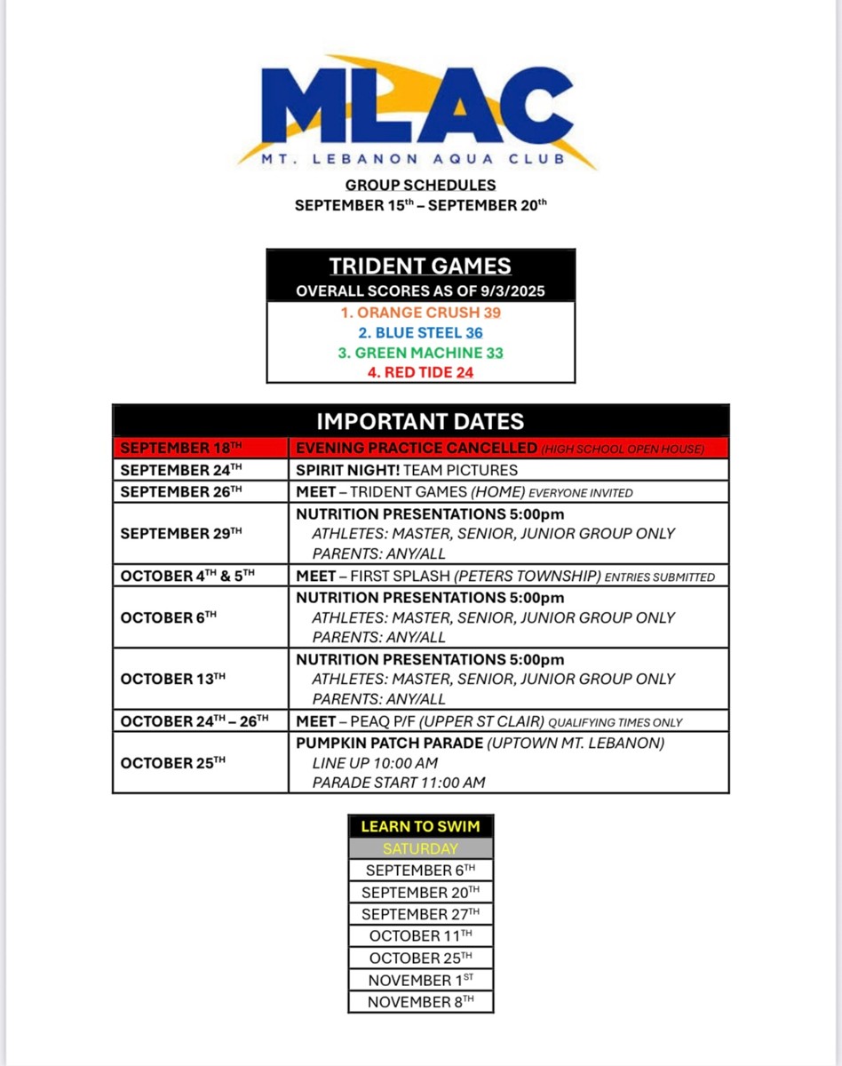 Thursday 9/18 updates below, attached, and posted in pool stands.