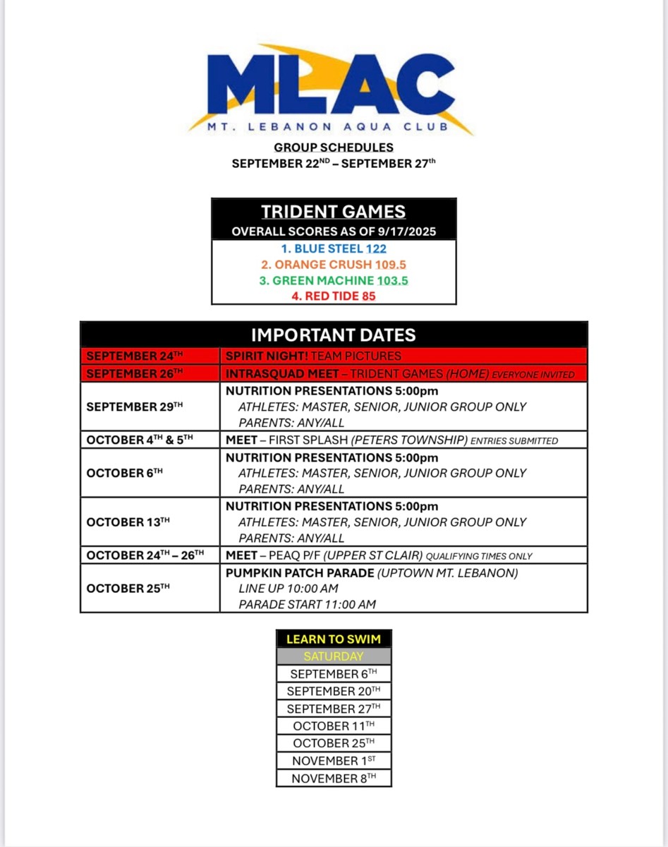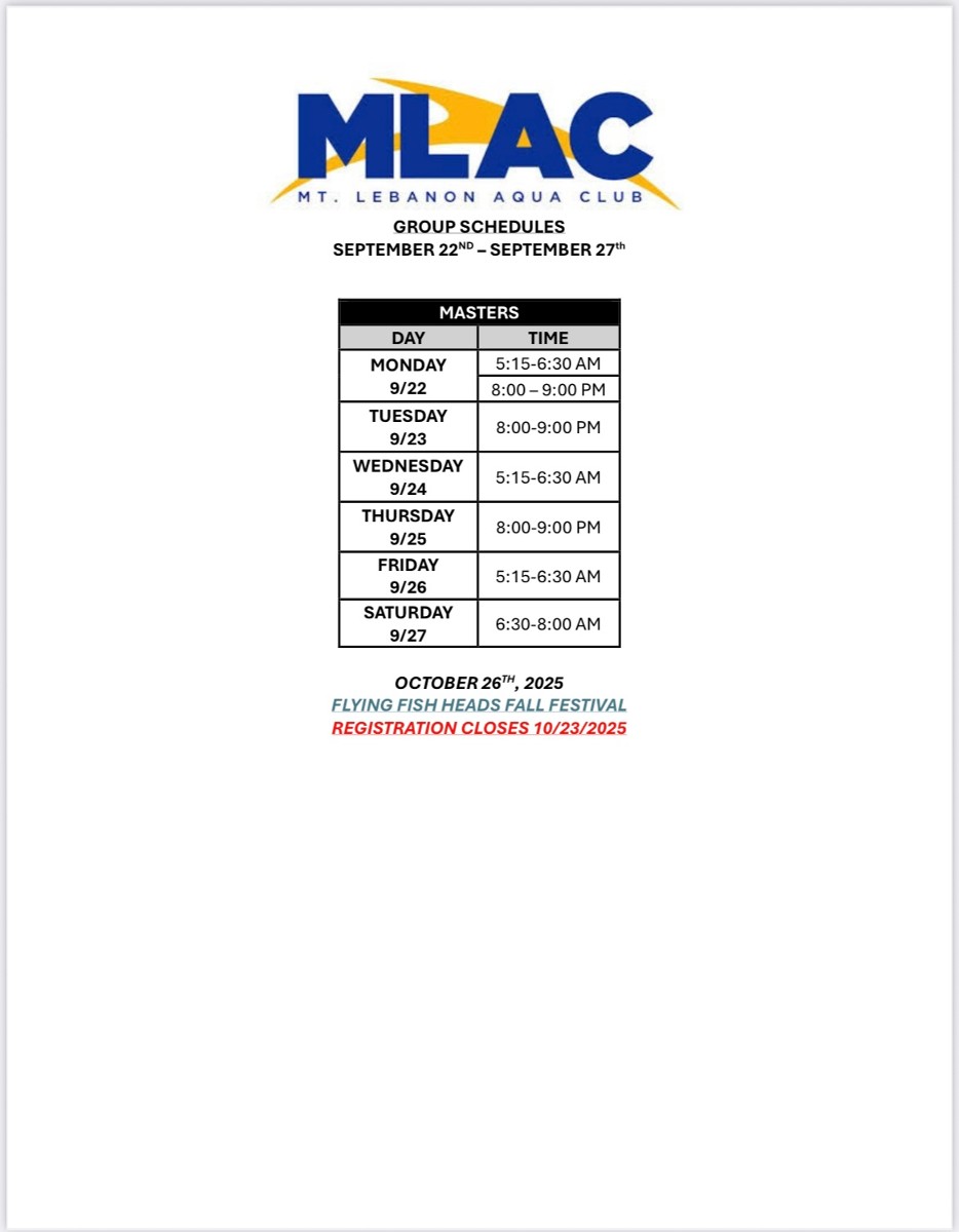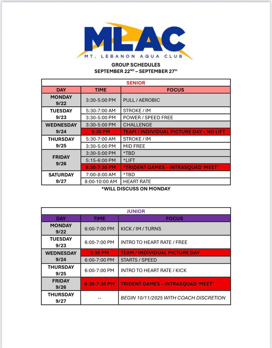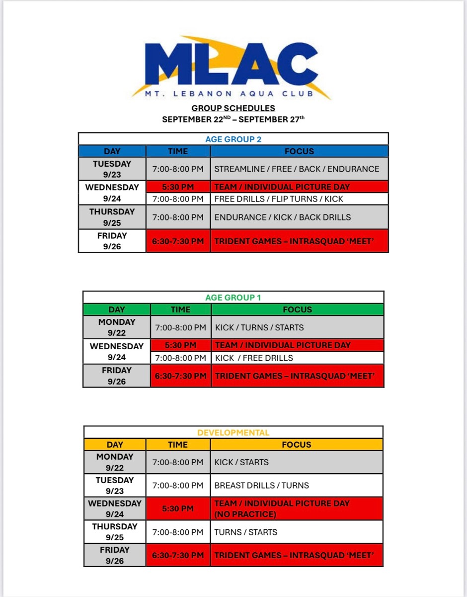 Attached you will find the full pool schedule for all MLAC groups. As you find your group label, you will see the general focus for each practice. This will give some insight into our coaching staff’s plan for the week and help you prepare accordingly. Schedules can also be found on the MLAC Home Page >> SportsEngine tab >> scroll down to “Latest News”