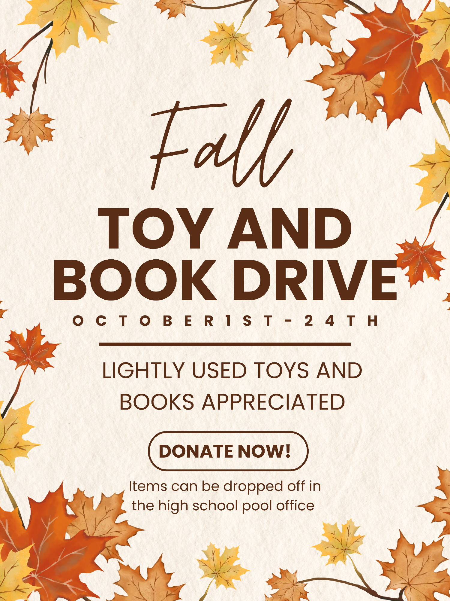 - Led by members of our Senior Group, they are looking to collect lightly used toys and books through the end of October! Please drop donations off in the stands, over by the month calendar and information board, or in the swim office. Thank you!