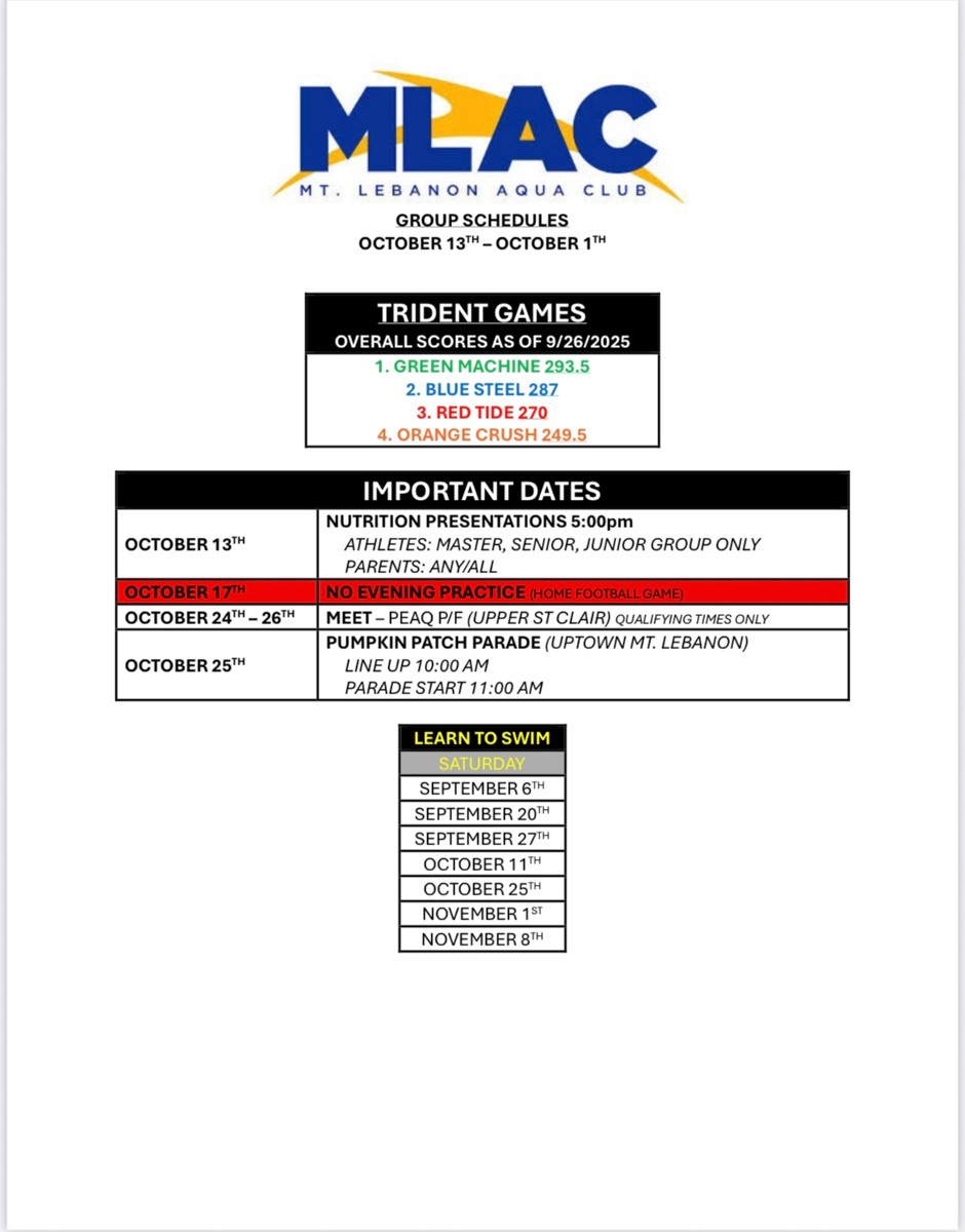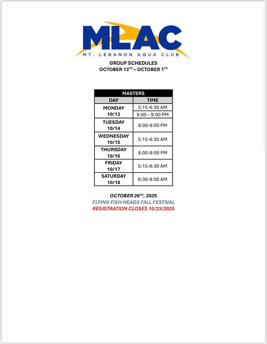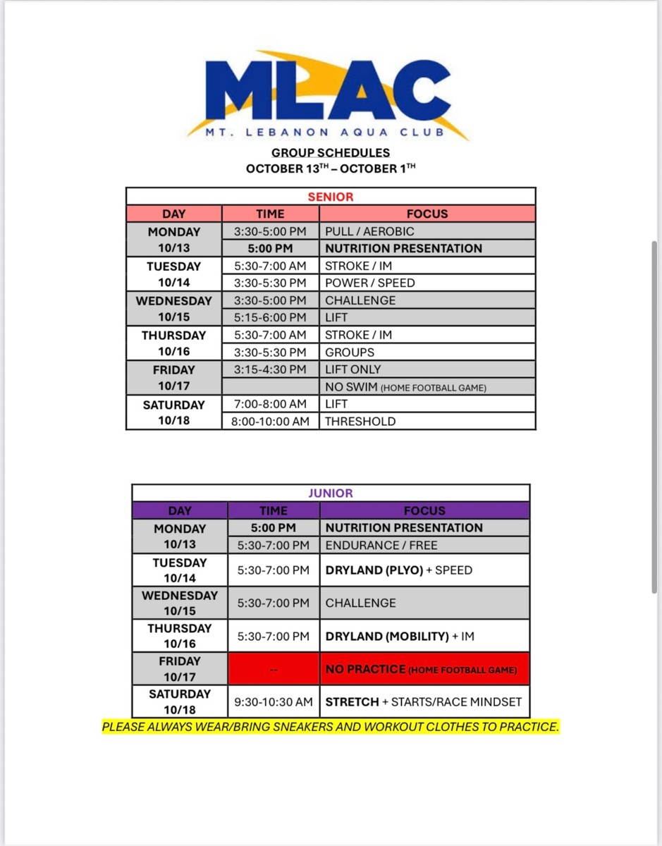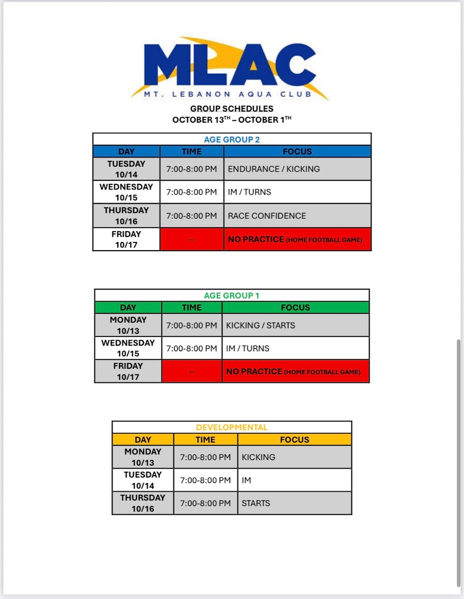 Attached you will find the full pool schedule for all MLAC groups. As you find your group label, you will see the general focus for each practice. This will give some insight into our coaching staff’s plan for the week and help you prepare accordingly. Schedules can also be found on the MLAC Home Page >> SportsEngine tab >> scroll down to “Latest News”