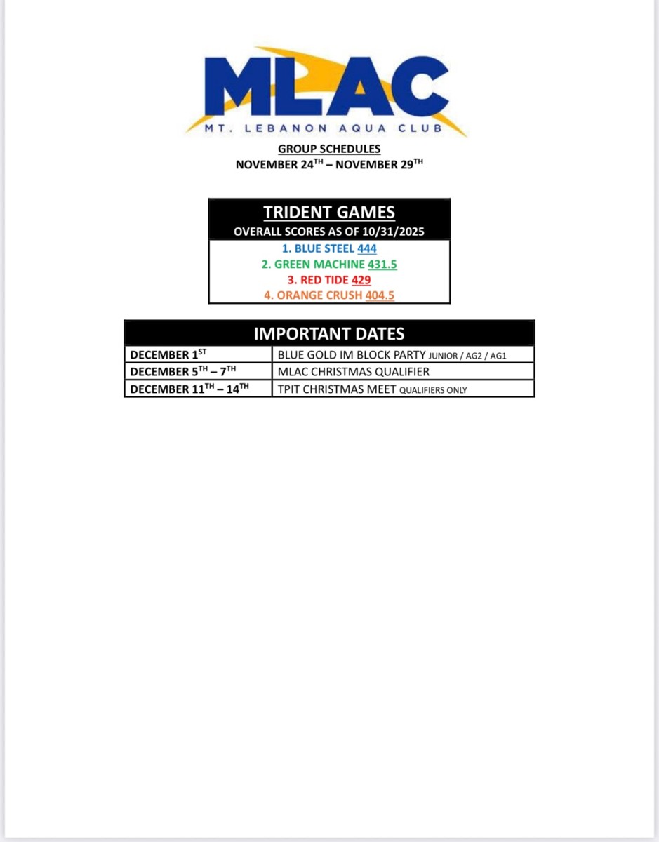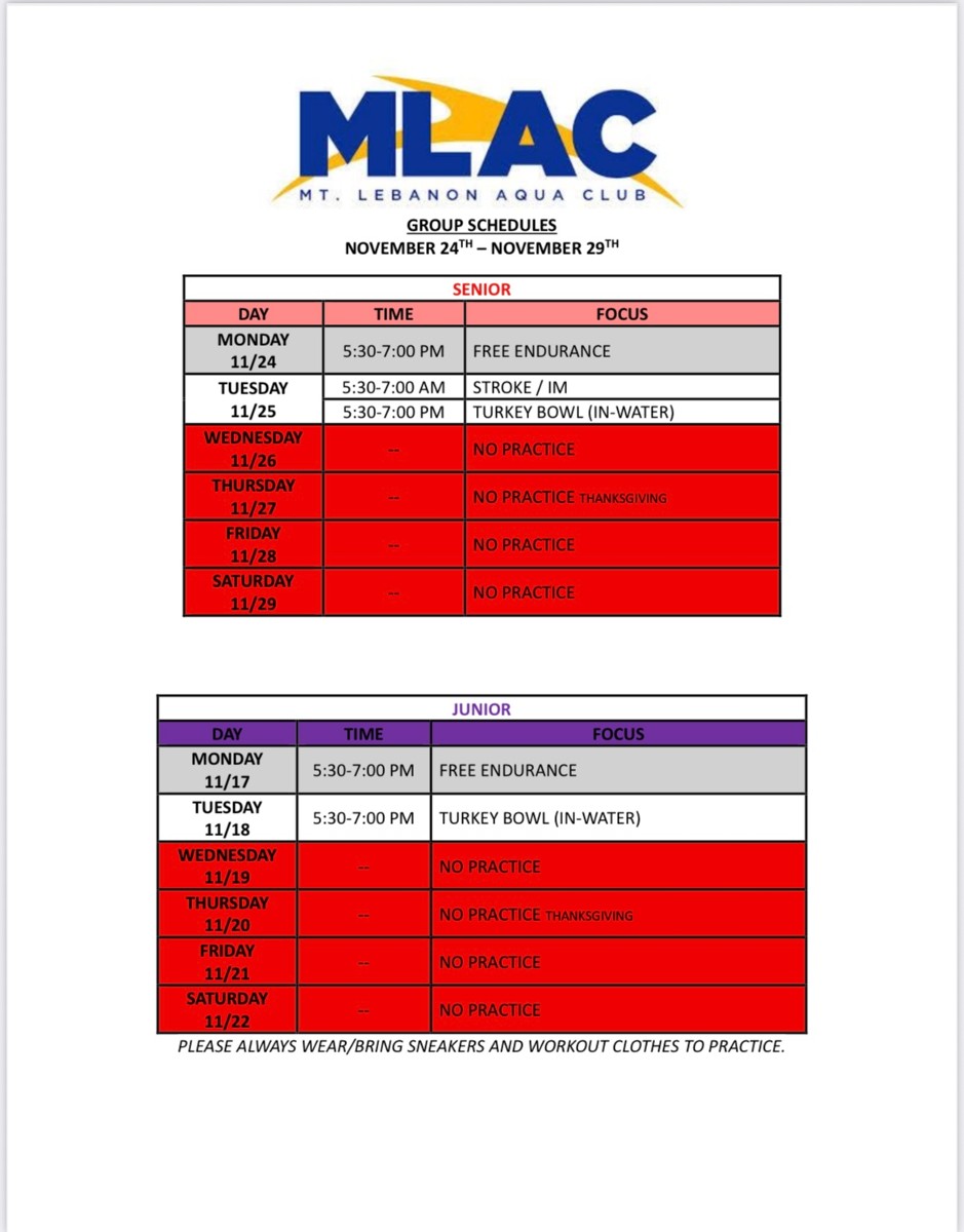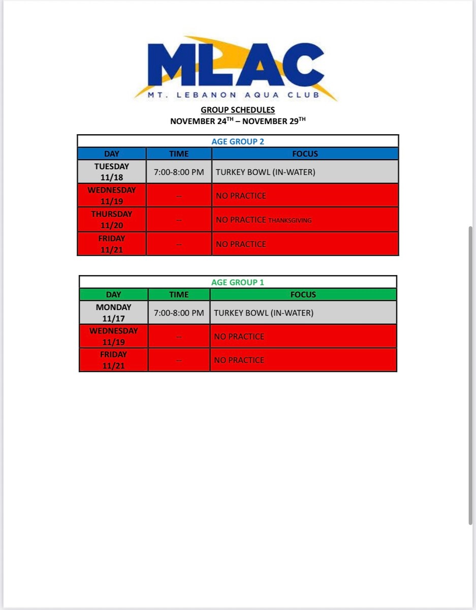 Attached you will find the full pool schedule for all MLAC groups. As you find your group label, you will see the general focus for each practice. This will give some insight into our coaching staff’s plan for the week and help you prepare accordingly. Schedules can also be found on the MLAC Home Page >> SportsEngine tab >> scroll down to “Latest News”