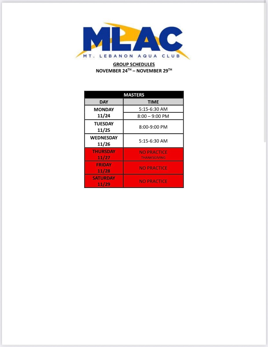 - Posted schedule is for MLAC (club) swimming. This is separate from MTLHS VARSITY swimming. Please refer to Coach Donati via Remind for Varsity practice schedule.