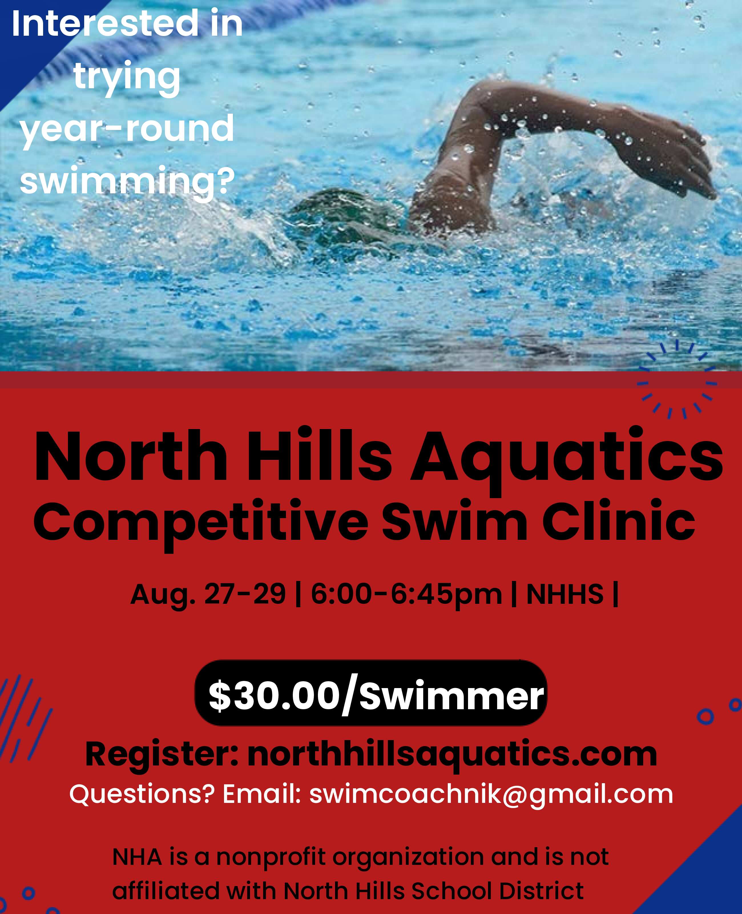 We will host a clinic for prospective members from August 27 through the 29th and 31st from 6:00pm to 6:45 pm at North Hills High School. Swimmers will be taken through drills, work on technique, and be evaluated for readiness to join the team. Please sign up on our registration page!