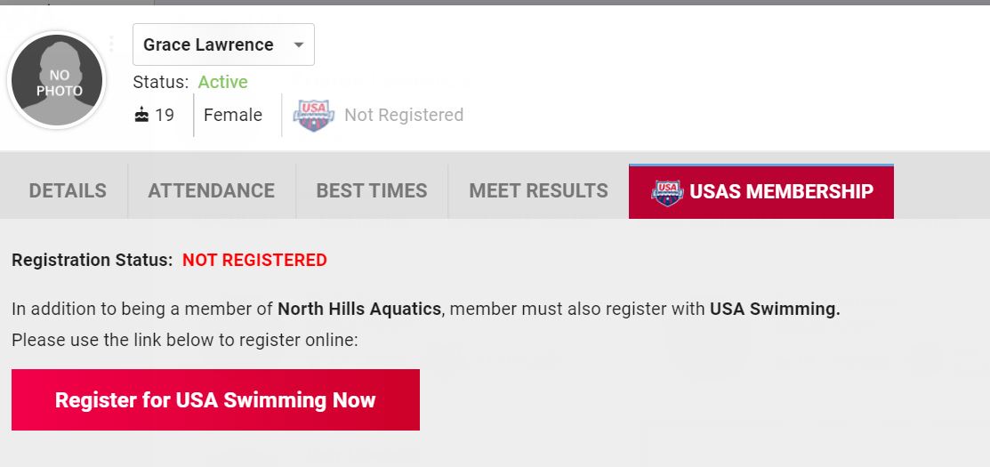 6. Once you click on your swimmer. Click red tab for USAS Membership.