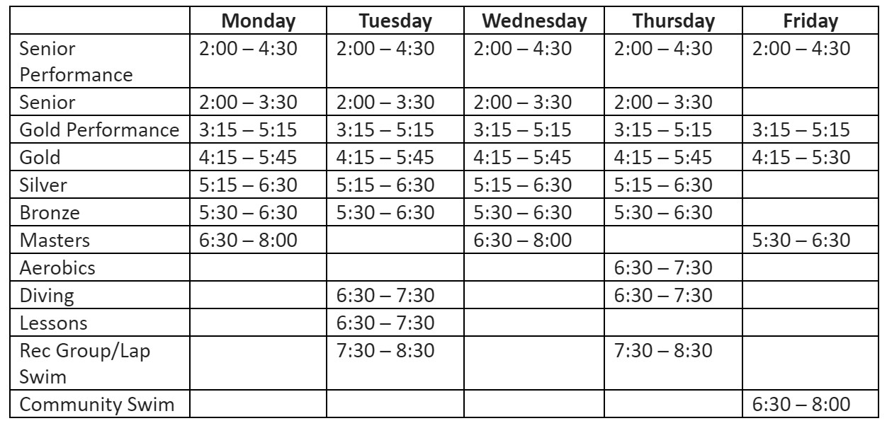 (please check calendar for live practice times - schedule may change due to pool availability)