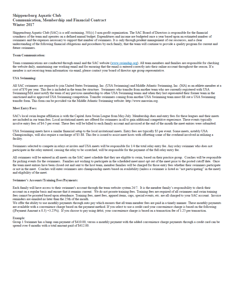 Shippensburg Aquatic Club (SAC) is a non-profit organization with an elected Board of Directors. The club provides swim instruction and competitive swimming opportunities to the Shippensburg community.