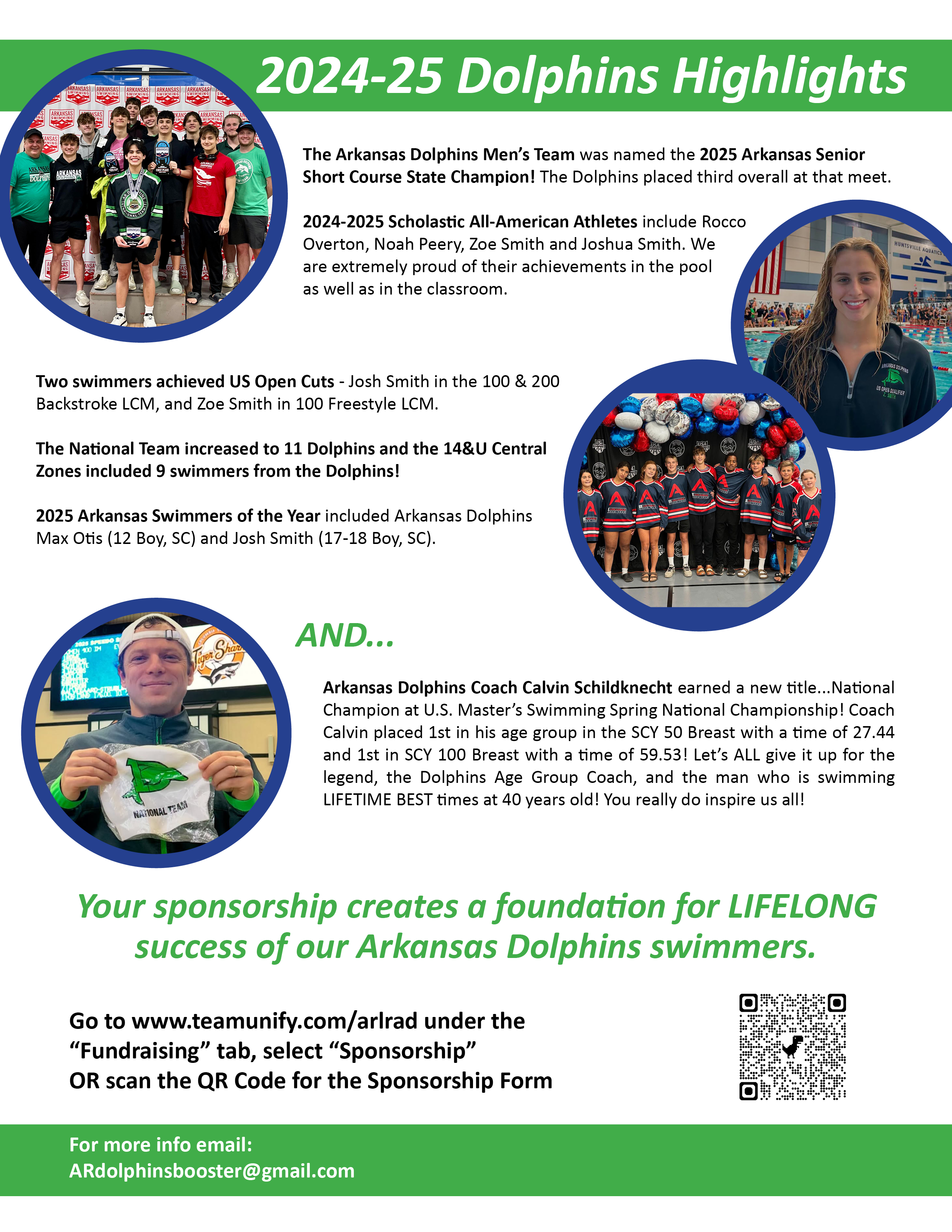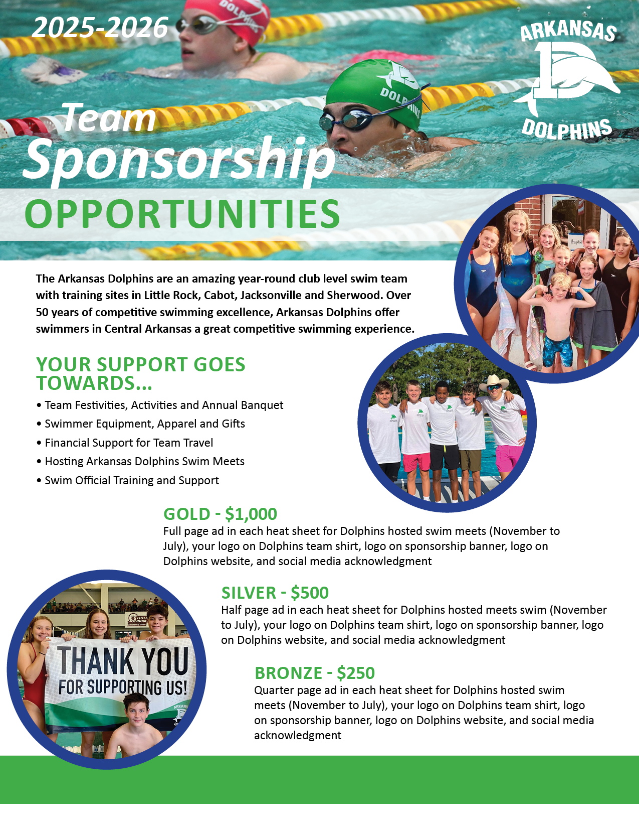 The Dolphin Booster Association is a non-profit organization comprised of all families on the team. The association supports the needs of the Arkansas Dolphins Swim Team. Your sponsorship is vital to the success of the Arkansas Dolphins.