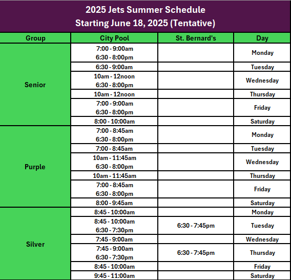 The end of summer banquet will be Thursday, July 31. All JETS Summer Swim families are welcome to attend. Every swimmer will be recognized at this fun event!