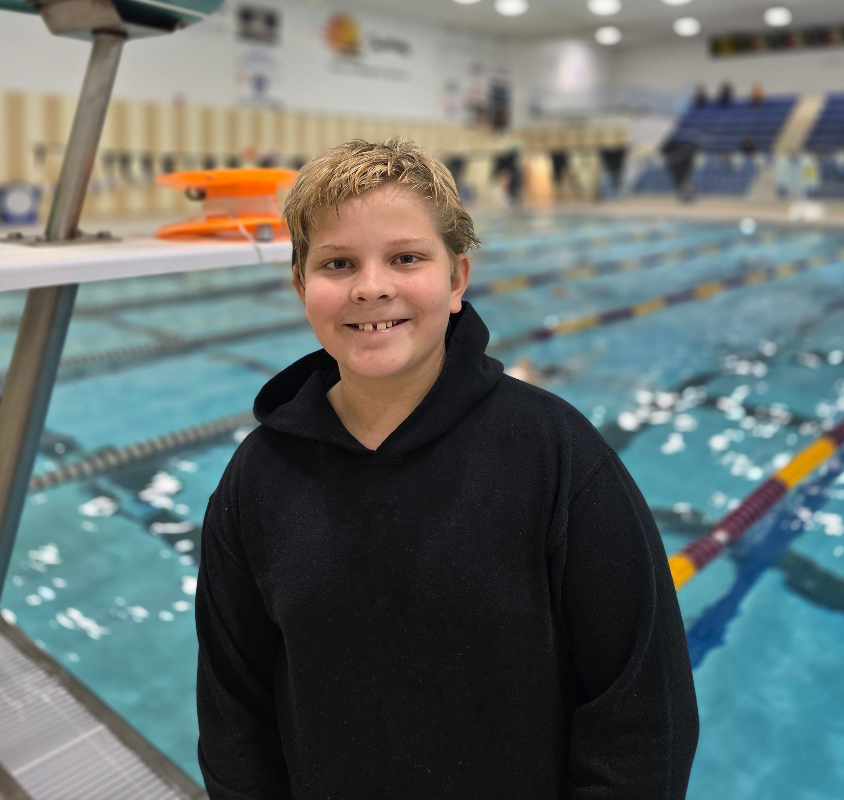 Our new Super Swimmer had a heck of a meet this past month! Robbie is in 6th grade, his favorite stroke is Freestyle, and his favorite events are the 50 Free and the 100 IM. His tip for swimmers at meets is to always try your hardest, and try eating an orange to fuel up