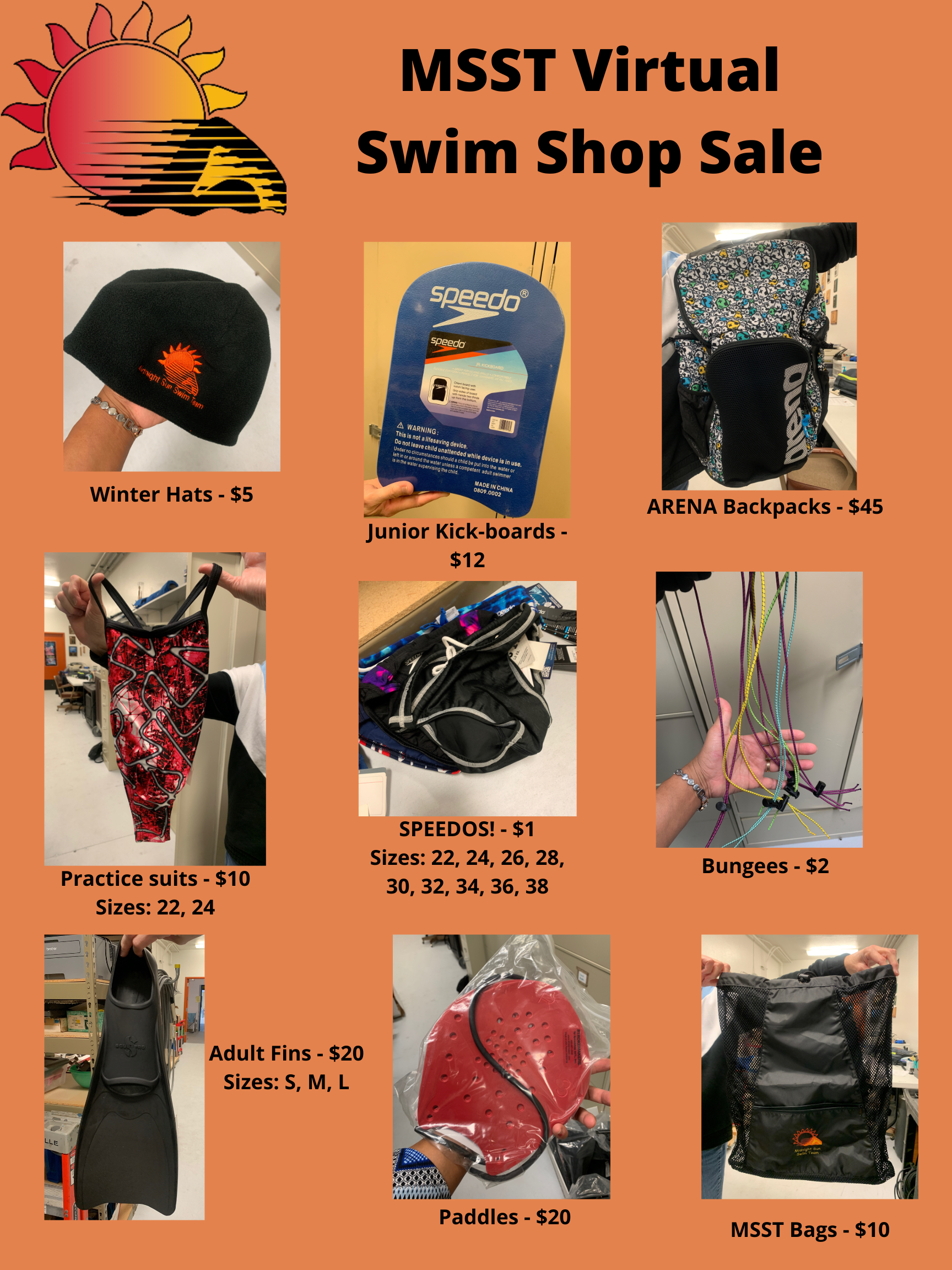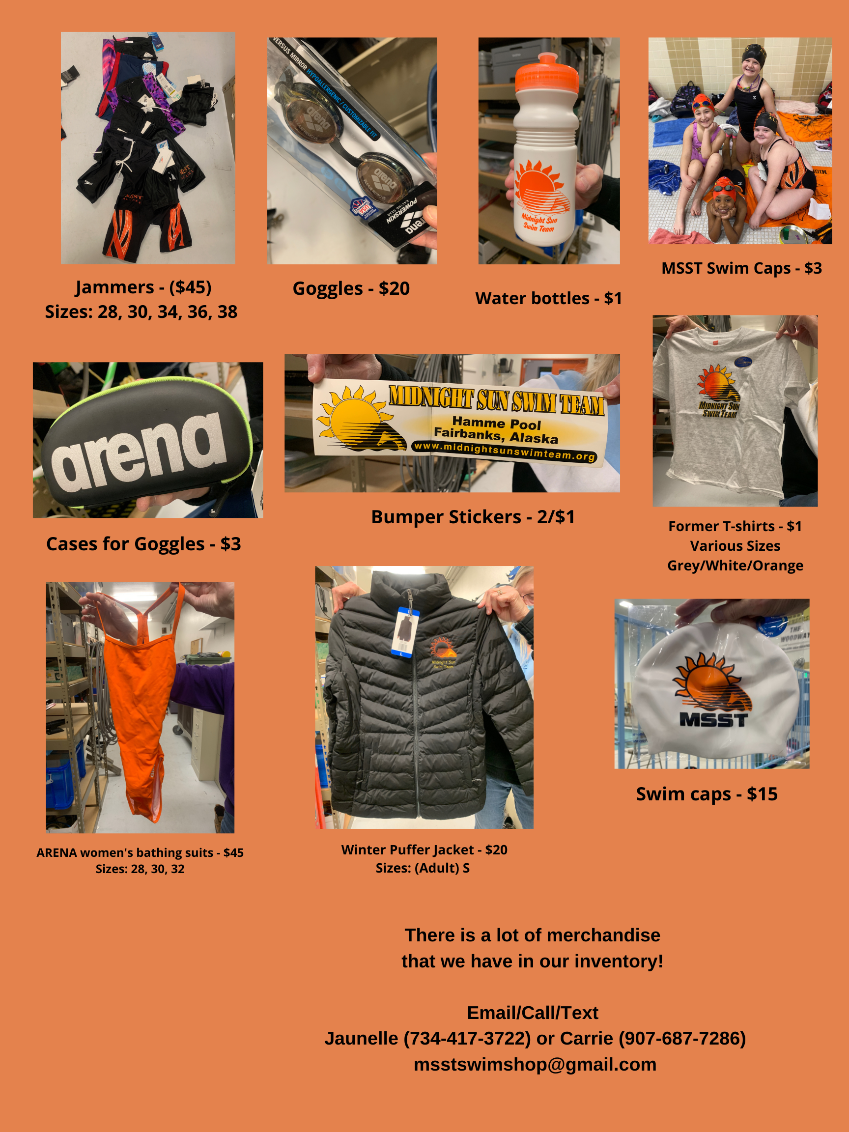Carrie Baker and Dragos Vas are happy to help you get your swimmer suited up. Our shop has team suits, team swim caps, team t-shirts, goggles, and bungee cords for goggles.