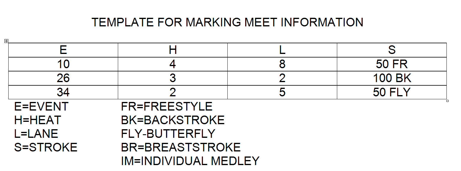 - Use four columns to show: event number, heat number, lane number and stroke.