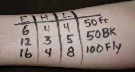 - Write meet information written on their arm (or thigh) with a Sharpie to help them keep track of their events. (Swimmers will also use the permanent markers to write slogans on the backs of teammates!).