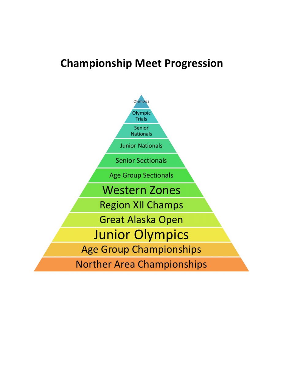 Championship Meets – Championship meets are the culmination of the season or a particular portion of the season and are typically faster than meets held as preliminary/ finals. Many championship meets have qualification standards (times) that must be met in order to compete at that meet. Our Northern Area Championship does not have qualification standards, and all of our swimmers are encouraged to compete in that meet. The remainder of our championship meets do have qualification standards, and this pyramid will show you the championship meet progression. All athletes that qualify for these meets should be in attendance at them.