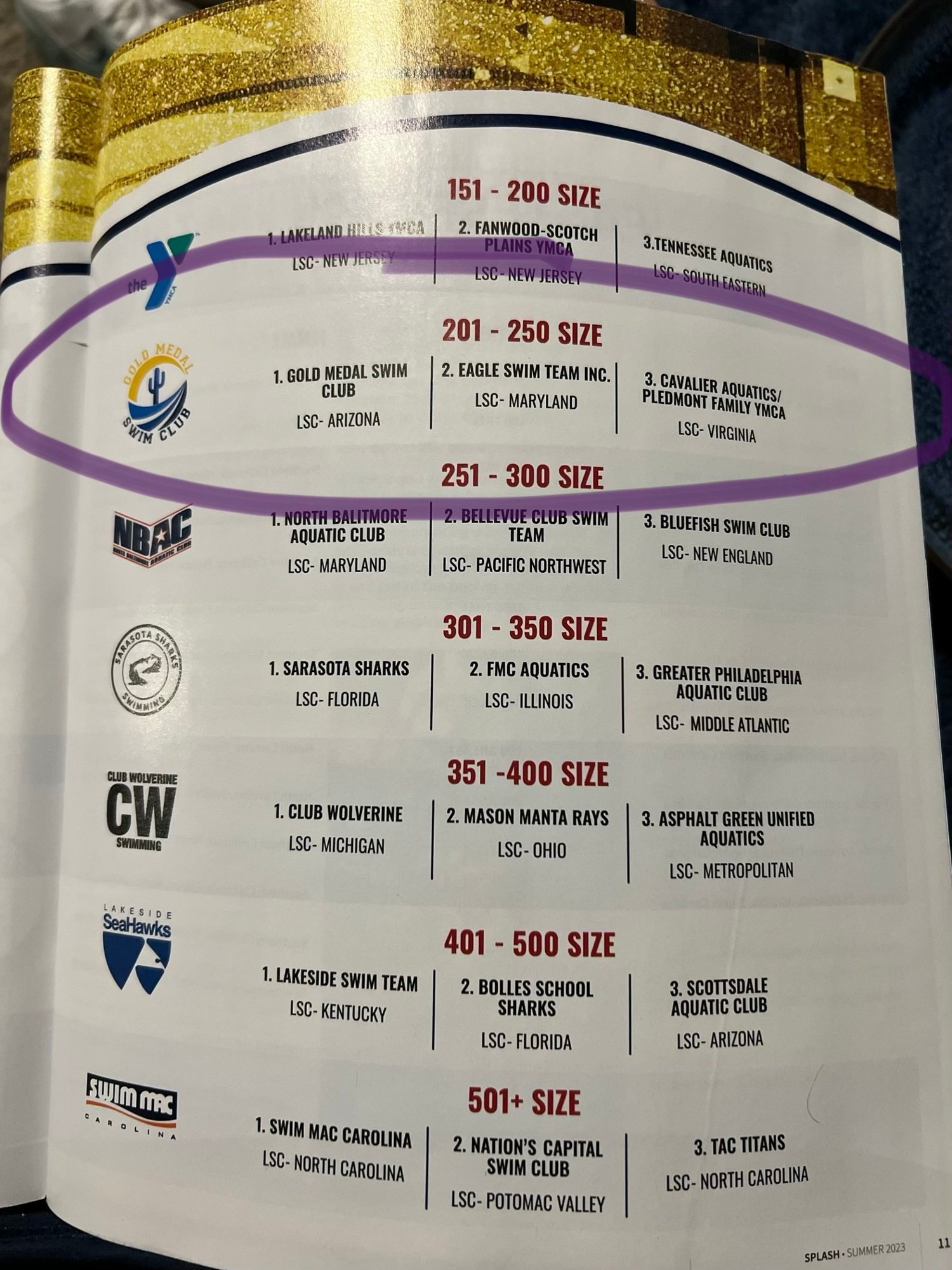 Gold Medal Swim Club was ranked the number one swim club in USA Swimming for teams having between 201-250 swimmers. This was based on performances during the short course season. Congratulations to all the swimmers and coaches that helped the team achieve this ranking.