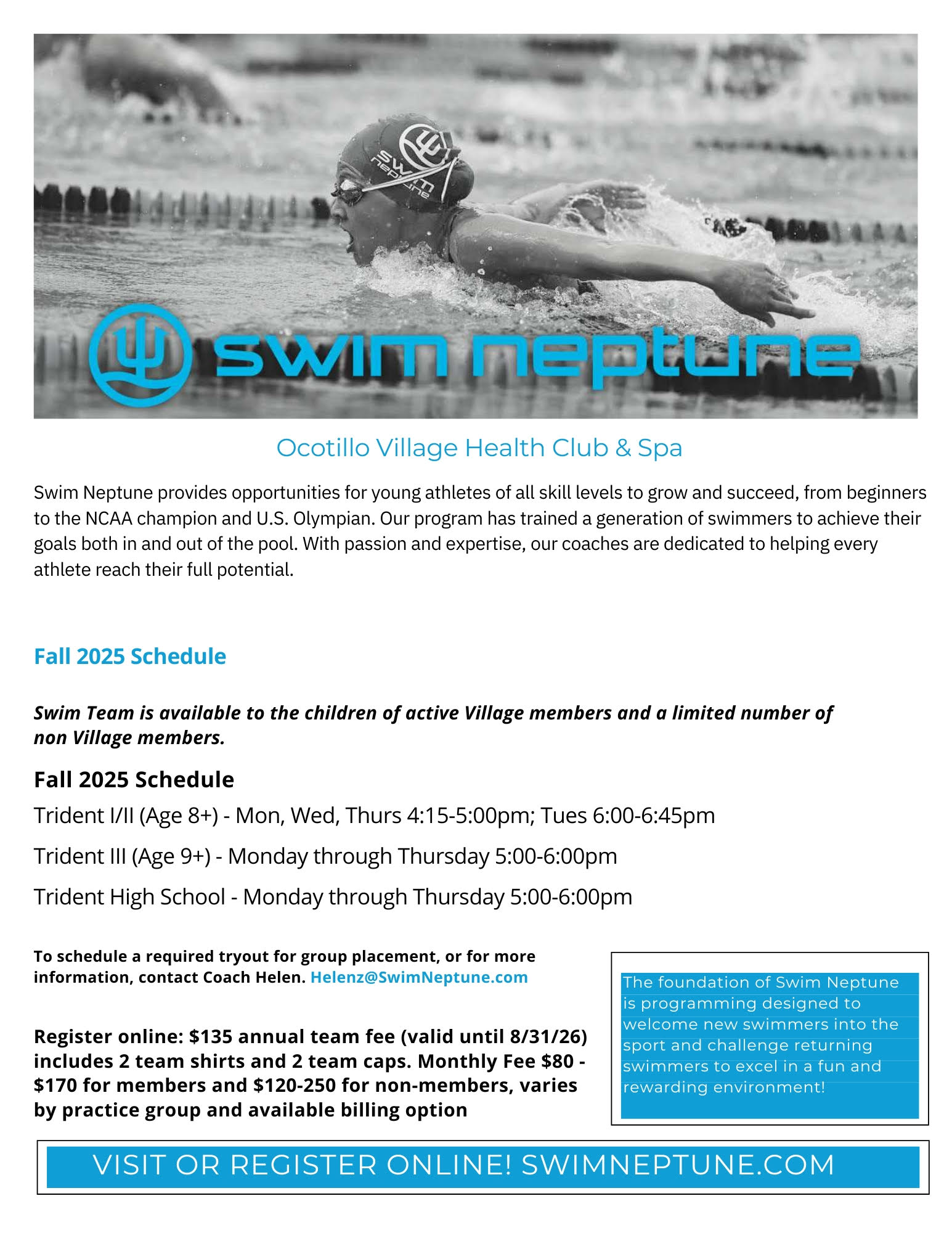 Swim Team is available to the children of active Village members and A limited number of non Village members.