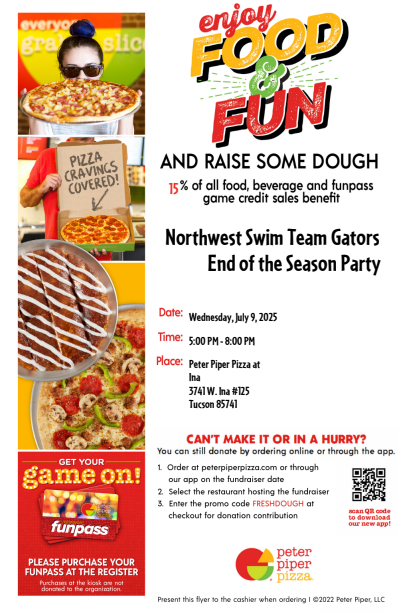 Join us on Wednesday, July 9 for our end of season party & fundraiser at Peter Piper Pizza! See the flyer for details.