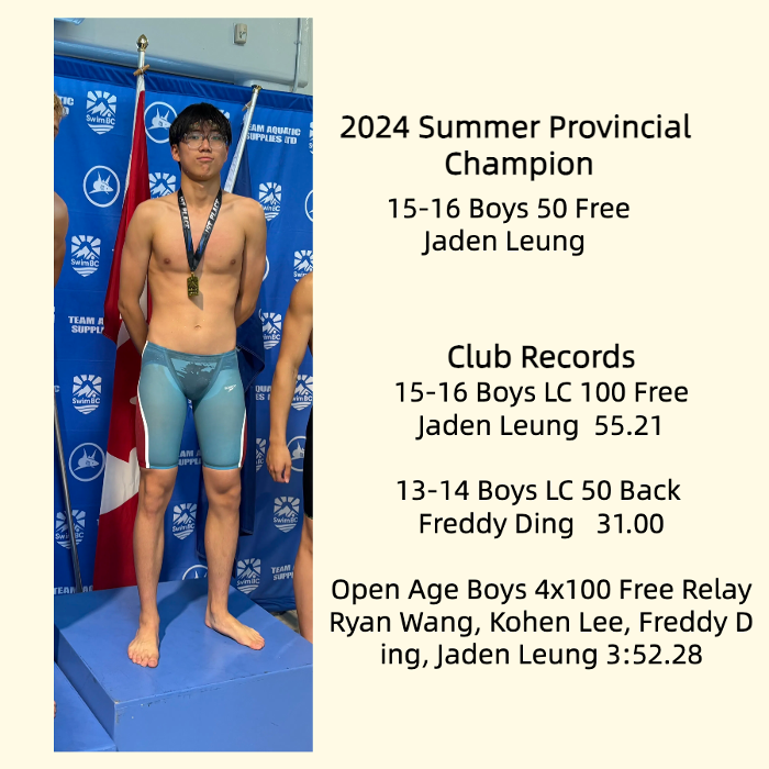 With the summer provincial ending, the team closed its participation in the high-level swim meets, leaving just room for the National swim meet (July 24th - July 28th) that will be held in Toronto, in which Jaden Leung will participate.