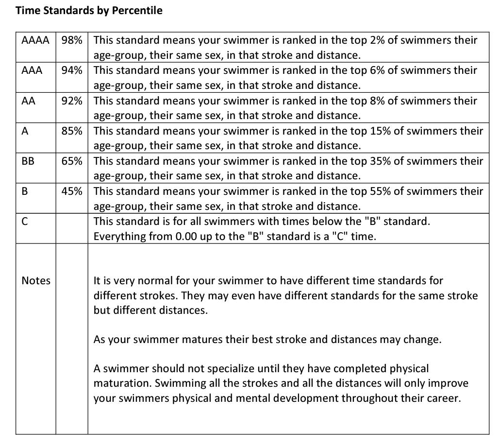 NOTE: It is very normal for your swimmer to have different time standards for different strokes. They may even have different standards for the same stroke but different distances. As your swimmer matures their best stroke and distances may change. A swimmer should not specialize until they have completed physical maturation. Swimming all the strokes and all the distances will only improve your swimmers physical and mental development throughout their career.