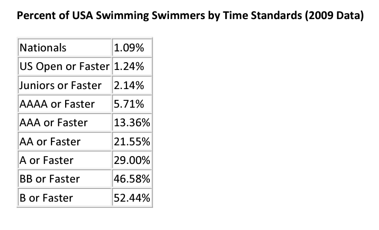 USA Swimming Top-16 Based Time Standards – B, BB, A, AA, AAA, AAAA - USA Swimming publishes sets of time standards for various reasons. One of the reasons behind standards is their usefulness for setting goals. They are also used to control the size of swim meets, as each higher or faster level in the standards has fewer swimmers - as the standards get faster, a smaller number of swimmers achieve them. Almost every swimming federation in the world uses some form of stepped standards within their system.