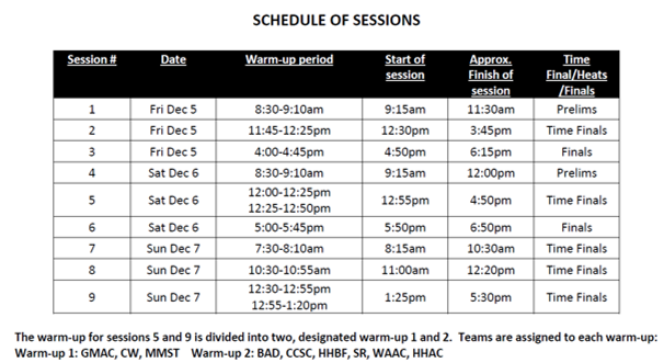 - session 9 12&under time finals, 12:30-1:20pm warm up, racing 1:25-5:45pm